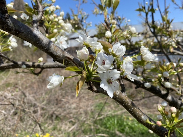 梨 梨の花も咲きました。毎年実は出来るのに、食べられるようにならない。ある程度大きくなったら黒くなったり落ちちゃったり...花は綺麗なのでいいんですけどね...