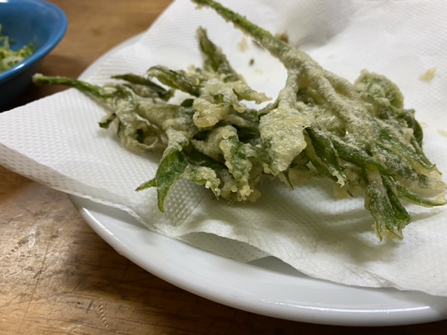 春の恵み ウドの若葉の天ぷら。スーパーでは手に入らない、春の恵み。神蕾ちゃんも今朝はまだまだ素っ気なかったのに、昼から急に来ました〜