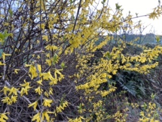 ポカポカ これぞ春、というようなとても春らしい1日でした。うちの裏にある連翹(たぶん支那連翹?)も満開です。今日は菜の花の辛子和えとつくしを食して、春を満喫。