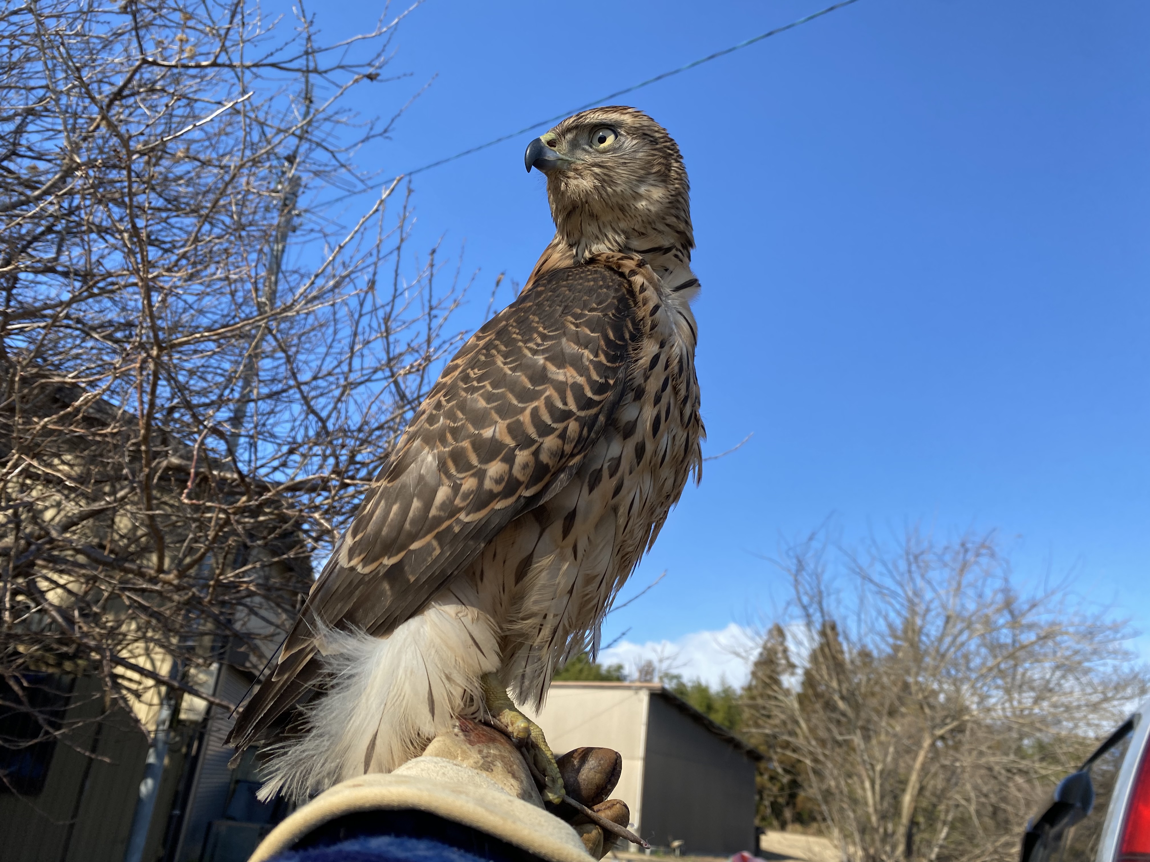 よっ 木にとまる瞬間。今日も活き餌でカモをあてました。昨日、はたかれたので躊躇するかと思いましたが、いつも通りに羽を割っていったのでホッとしました。