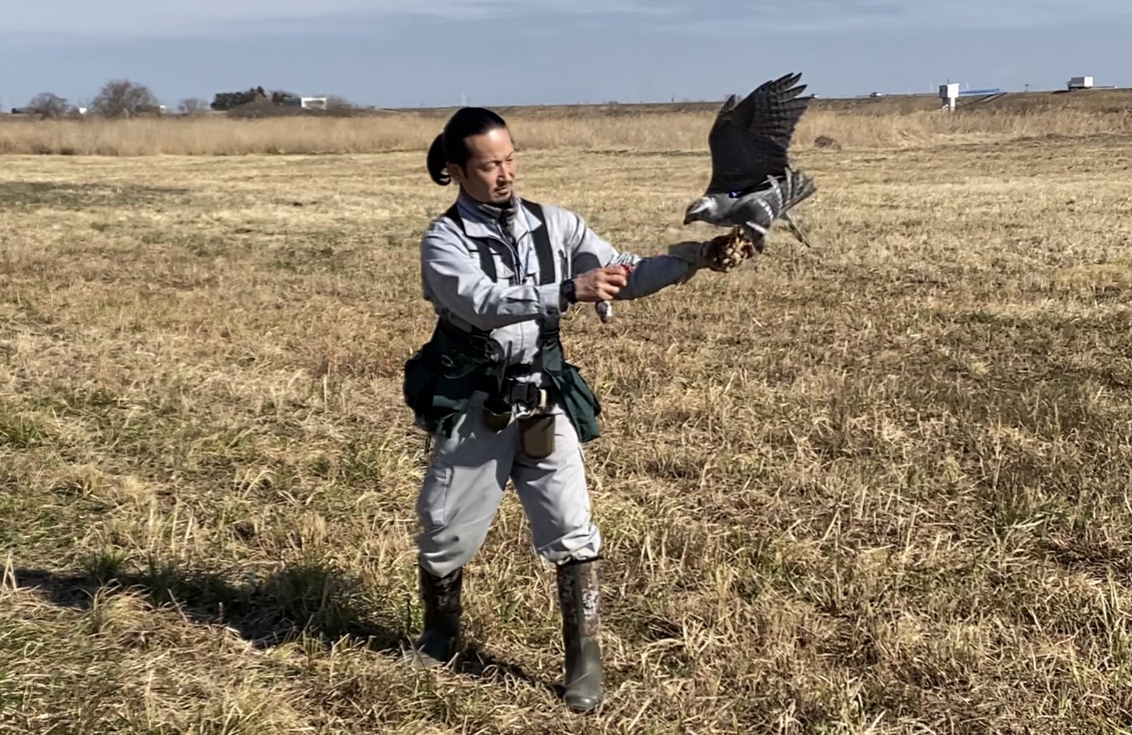 飛ぶ飛ぶ 訓練。今日も活き餌でカモをあてました。今日は掴みどころが悪く、脇腹を掴んでカモに翼ではたかれてしまいましたが、それでもカモを離しませんでした。