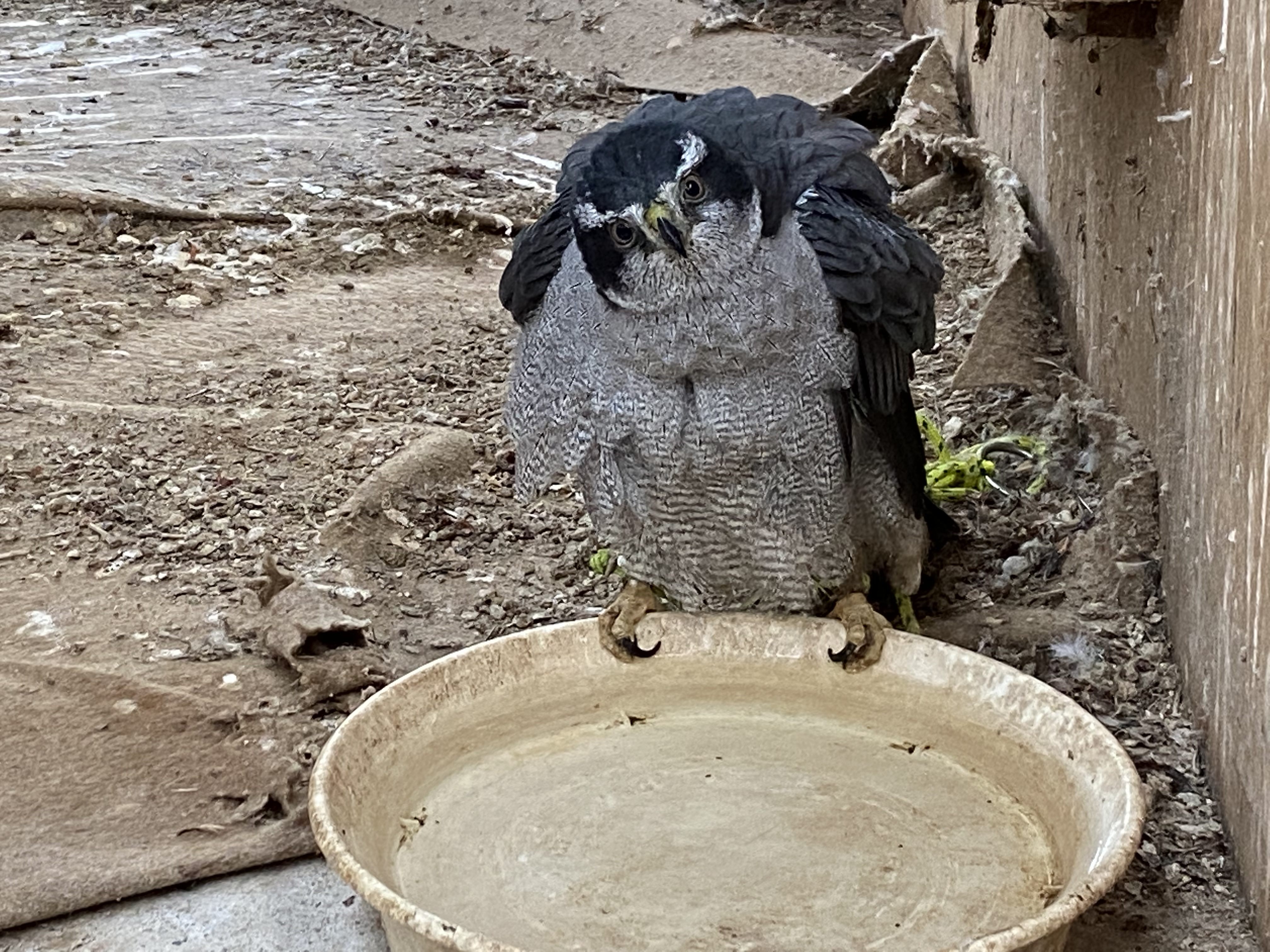 水換え 寒空の下鳥たちの水容器をひたすら洗う。私が水を入れてることを理解しているのか、訓練していない鳥たちも器やバケツを持って近づいても嫌がったりしなくなっています。特に慣れてるような子たちは水入れた途端目の前で水浴びしてくれます。画像はアメリカオオタカ君。「入ってい〜い?」この後しっかりビショ濡れに...