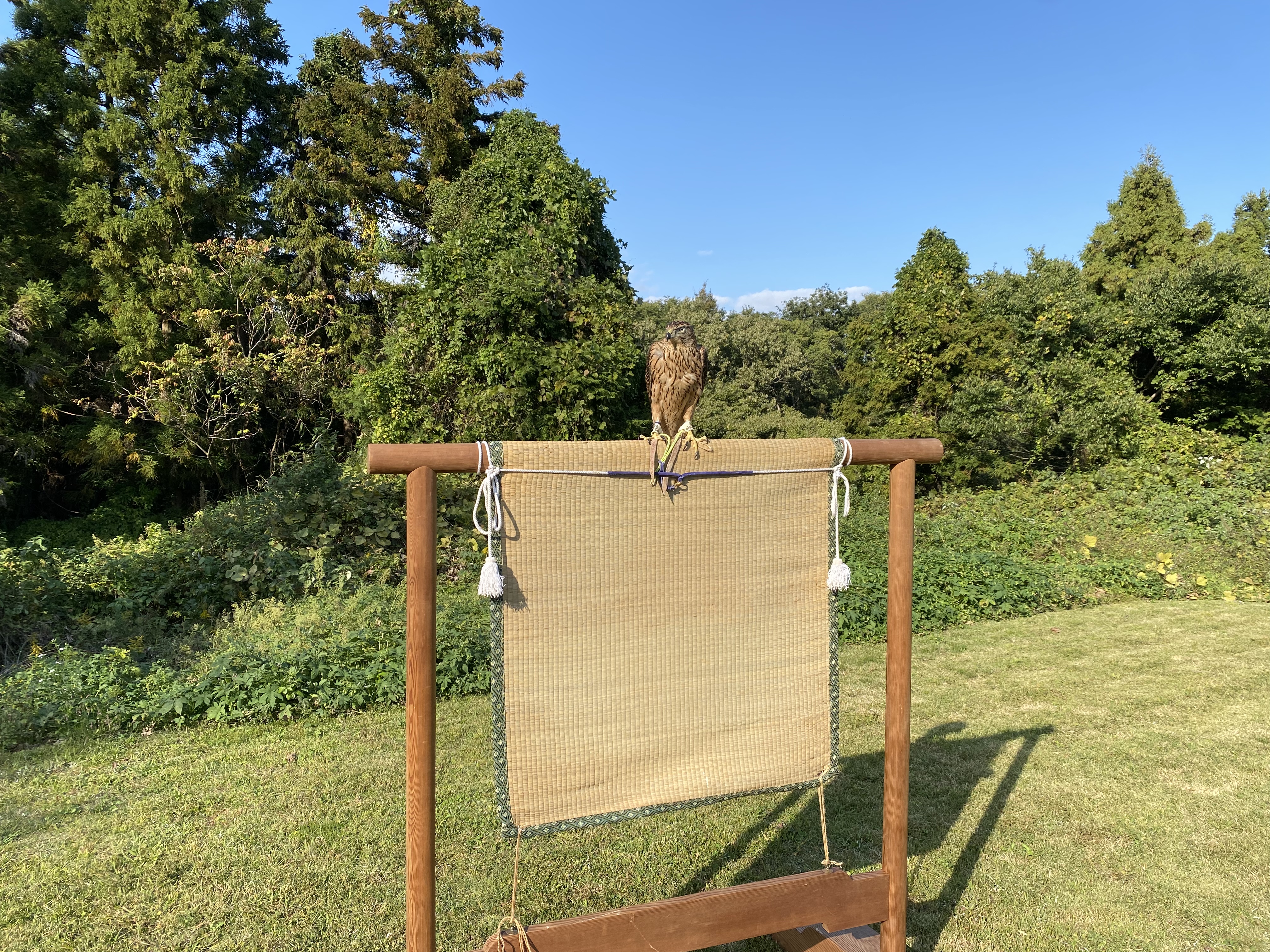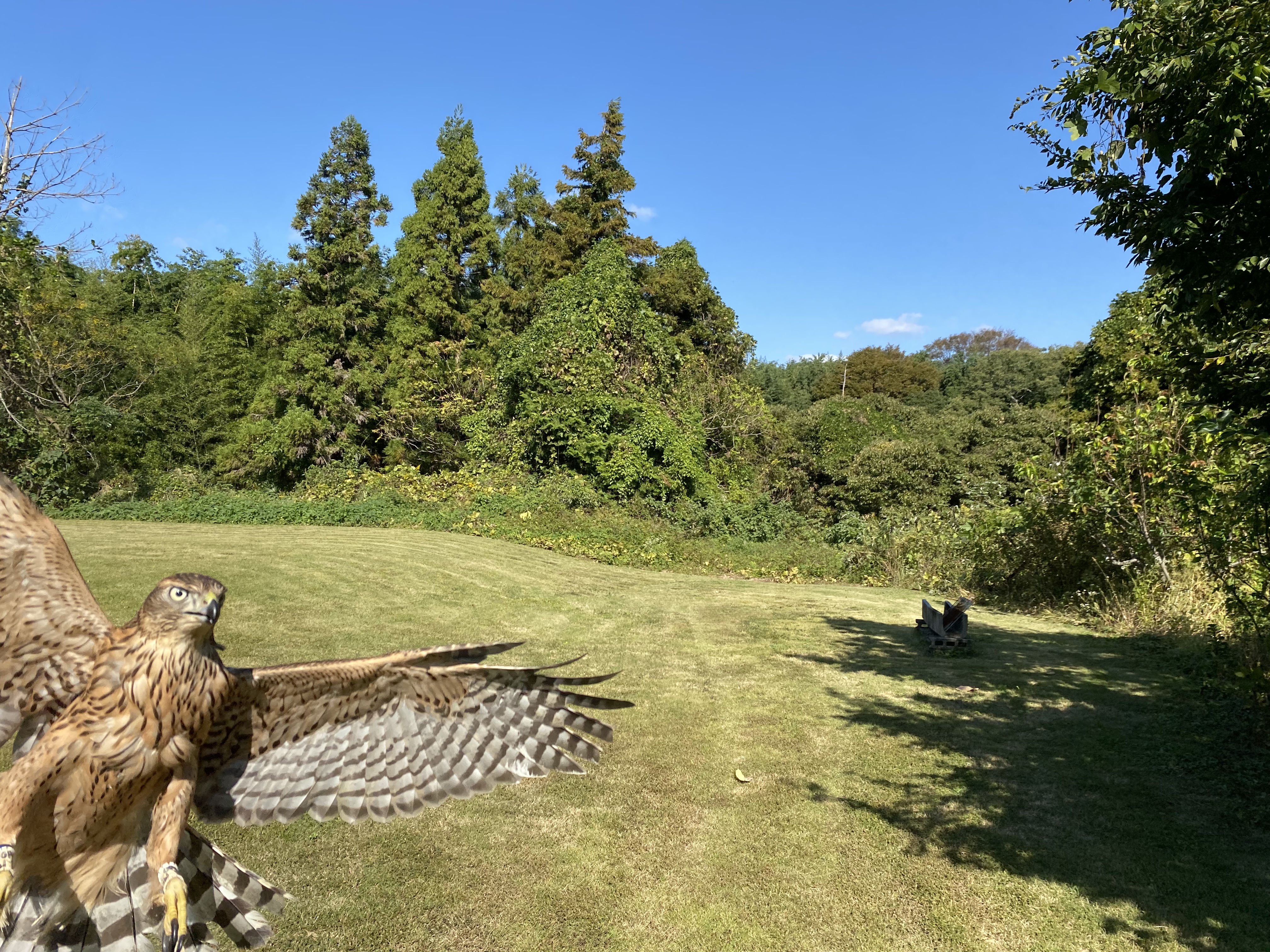鷹匠補研修2日目 午前中は研修会神影でフリバトをお昼はおちょぼへ行き午後はハリスちゃんの訓練を。画像は午後のひとこま。