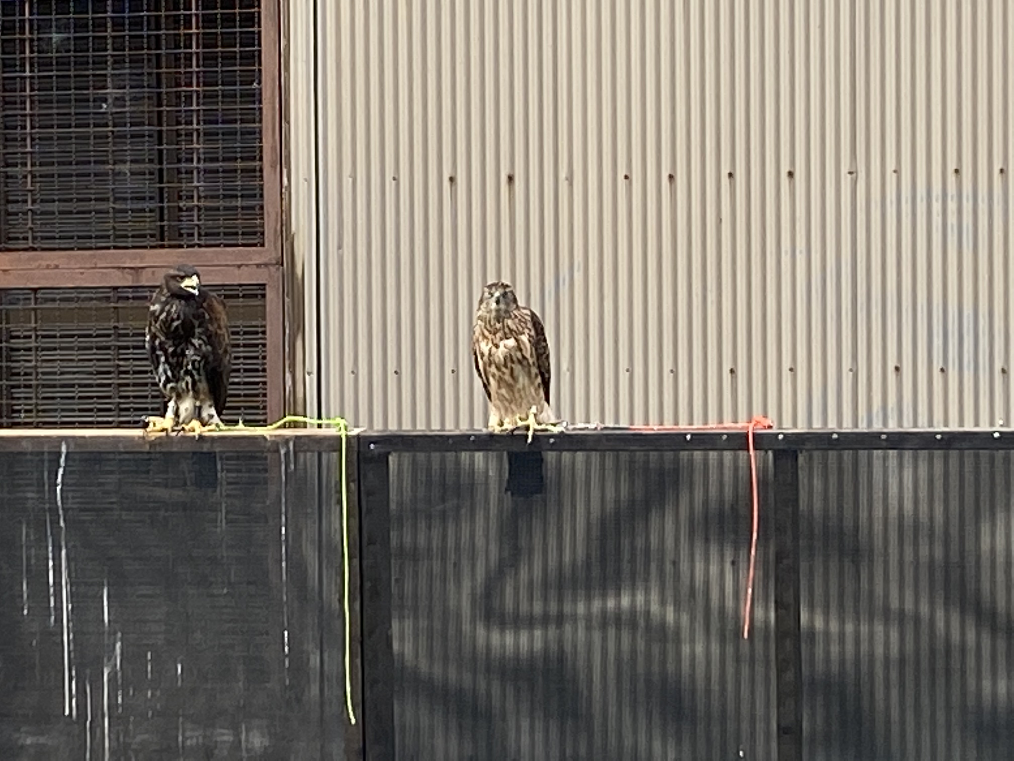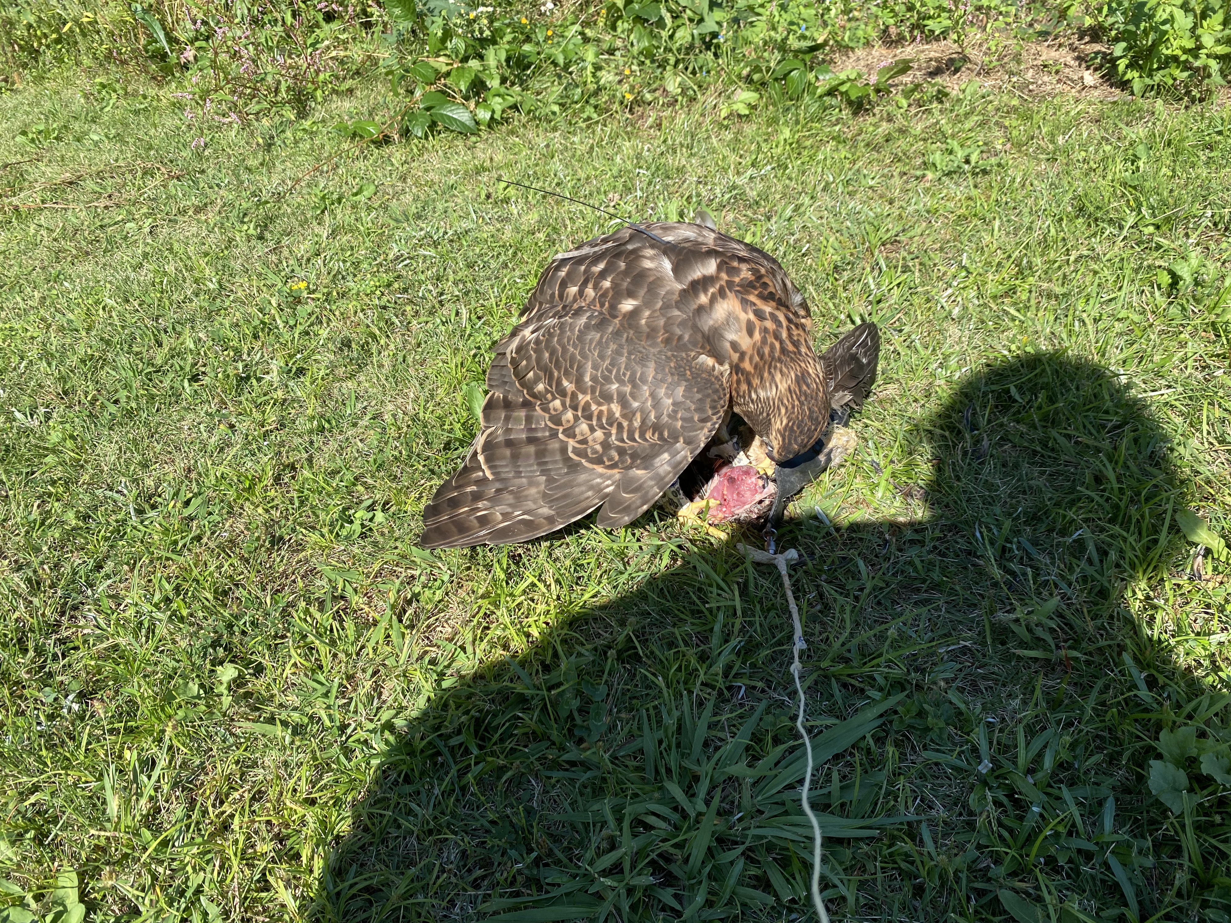 今日は半分お休み 昨日から今日午前中は用事があり、多分店に戻れないだろうと思い、ルアーの餌を多めにしていたので、神影はお休み、午後からハリスちゃんだけ訓練しました。ハリスちゃんは忍縄付きで今日やっと5〜メートル飛んで来るようになりました。昨日までは飛んで拳にとまることが怖かったらしく、2〜3メートル以上離れると地面におりて走ってきていたので、やっと鳥らしくなってきたかな?という感じです。