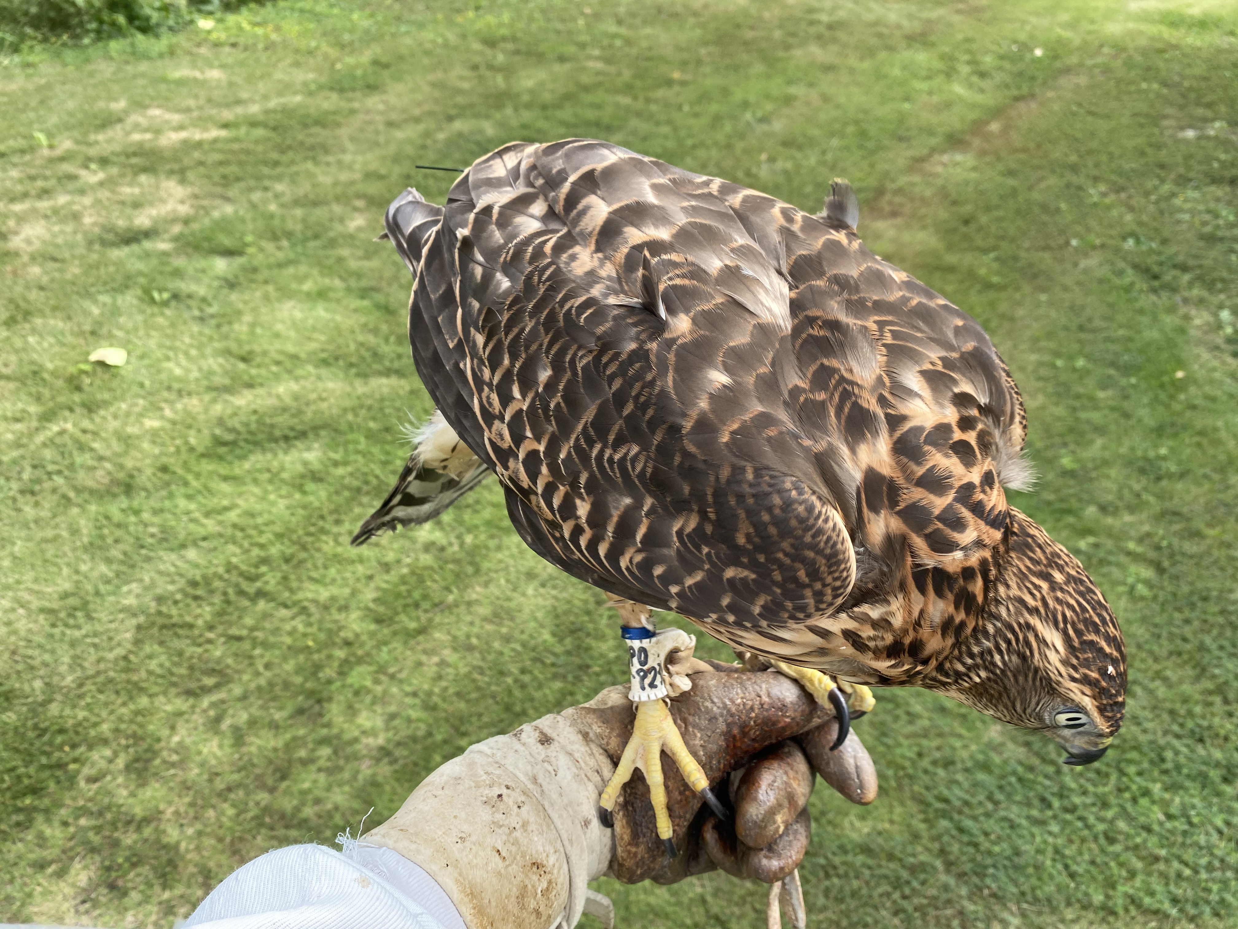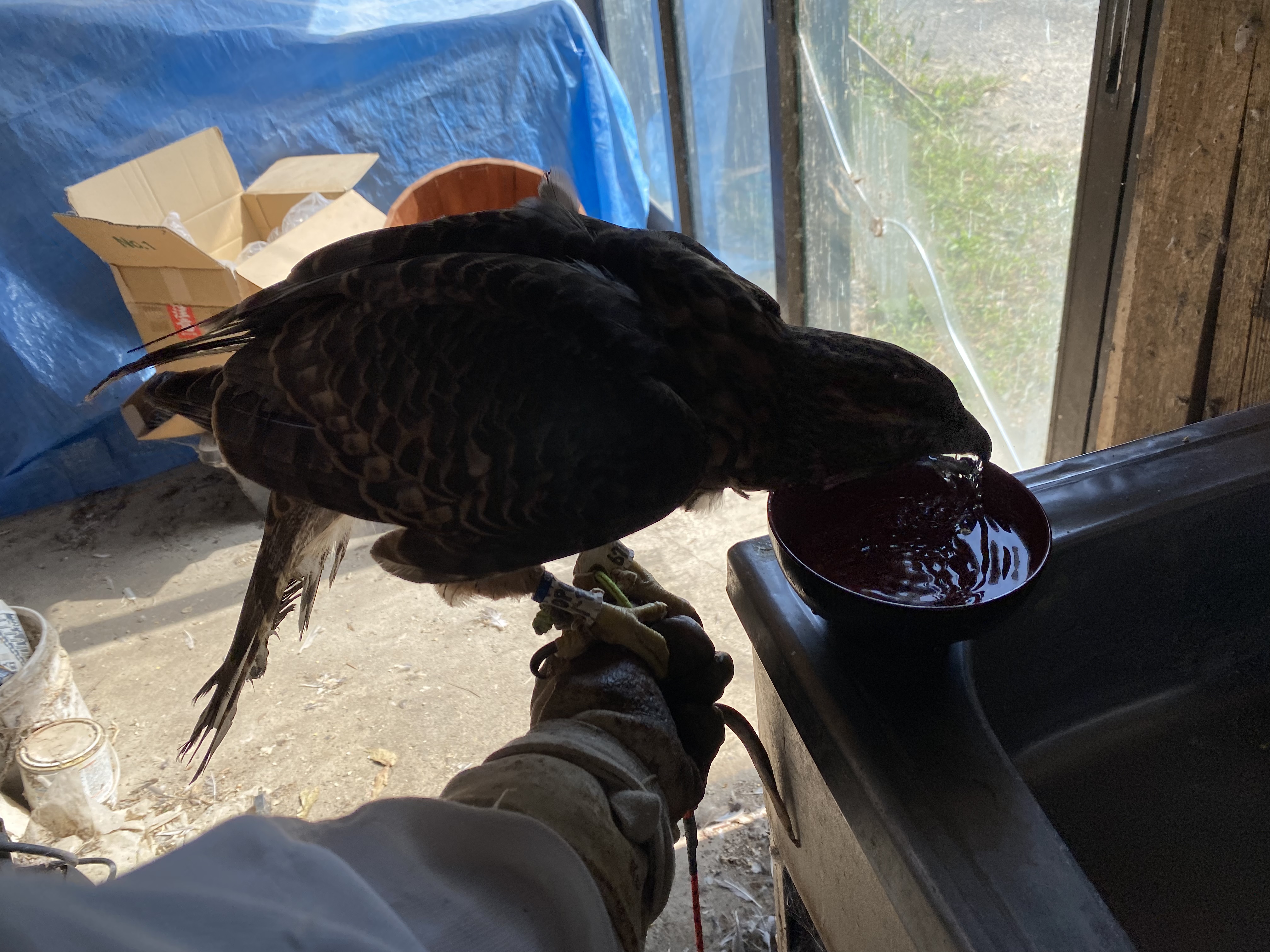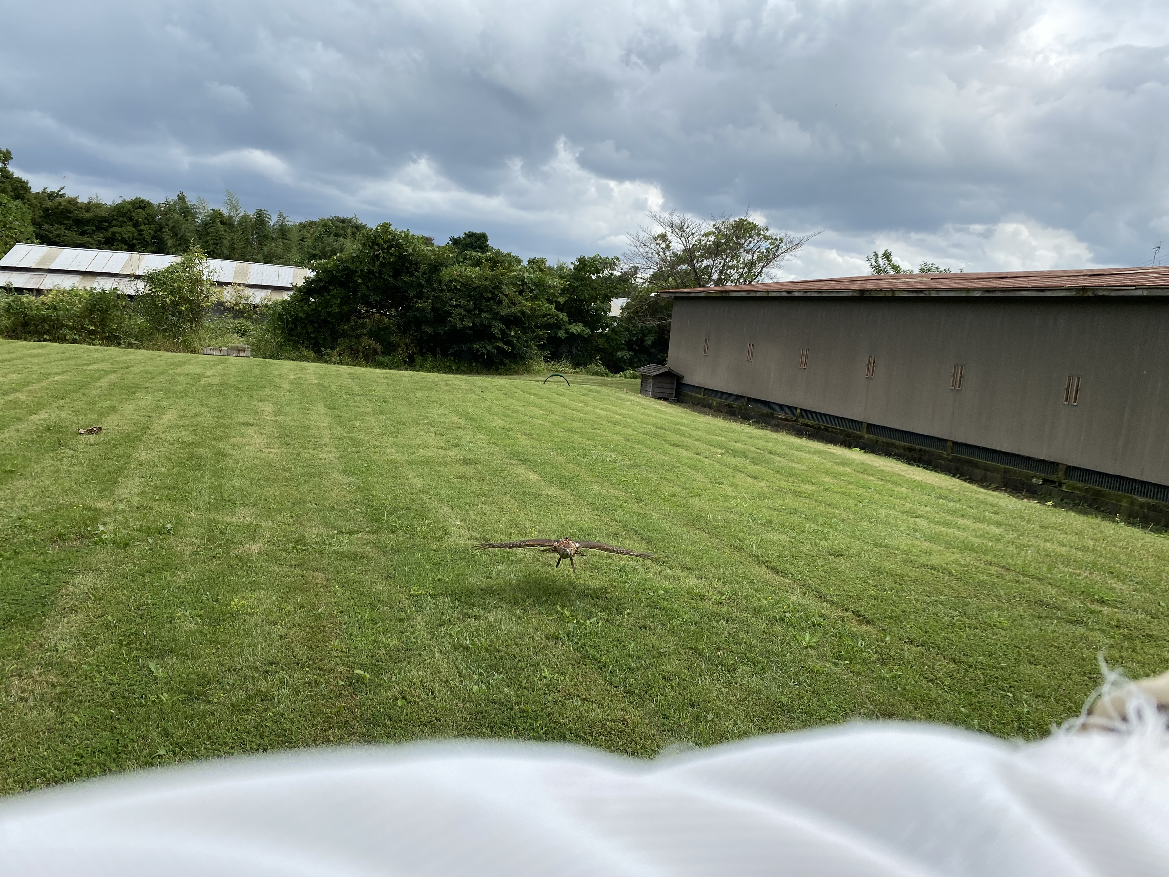 ぴょっ と左右対称に羽が飛び出てました。今日は来客の合間をぬって、放鷹協会の総会までに何回かに分けて訓練をしました。
