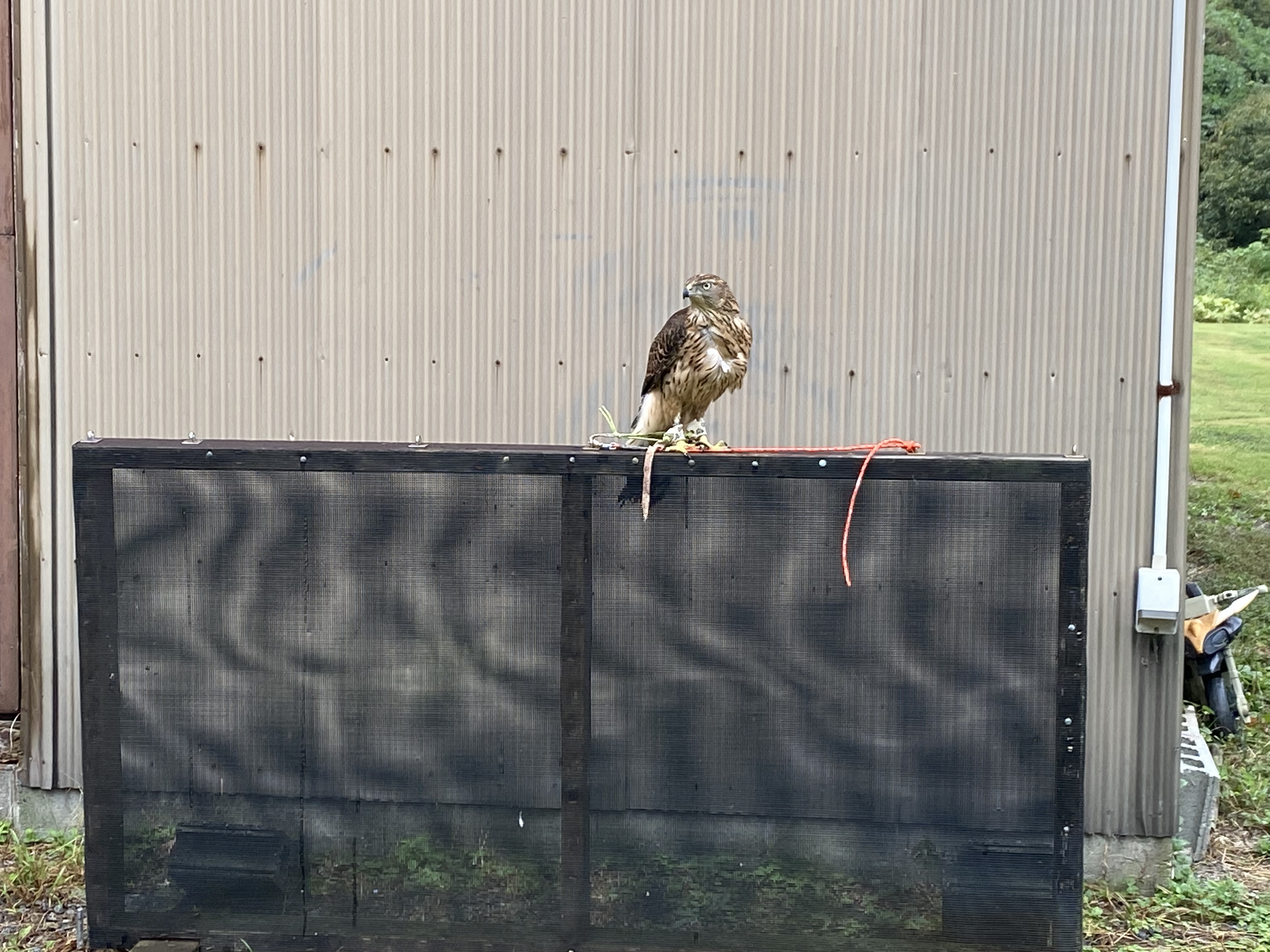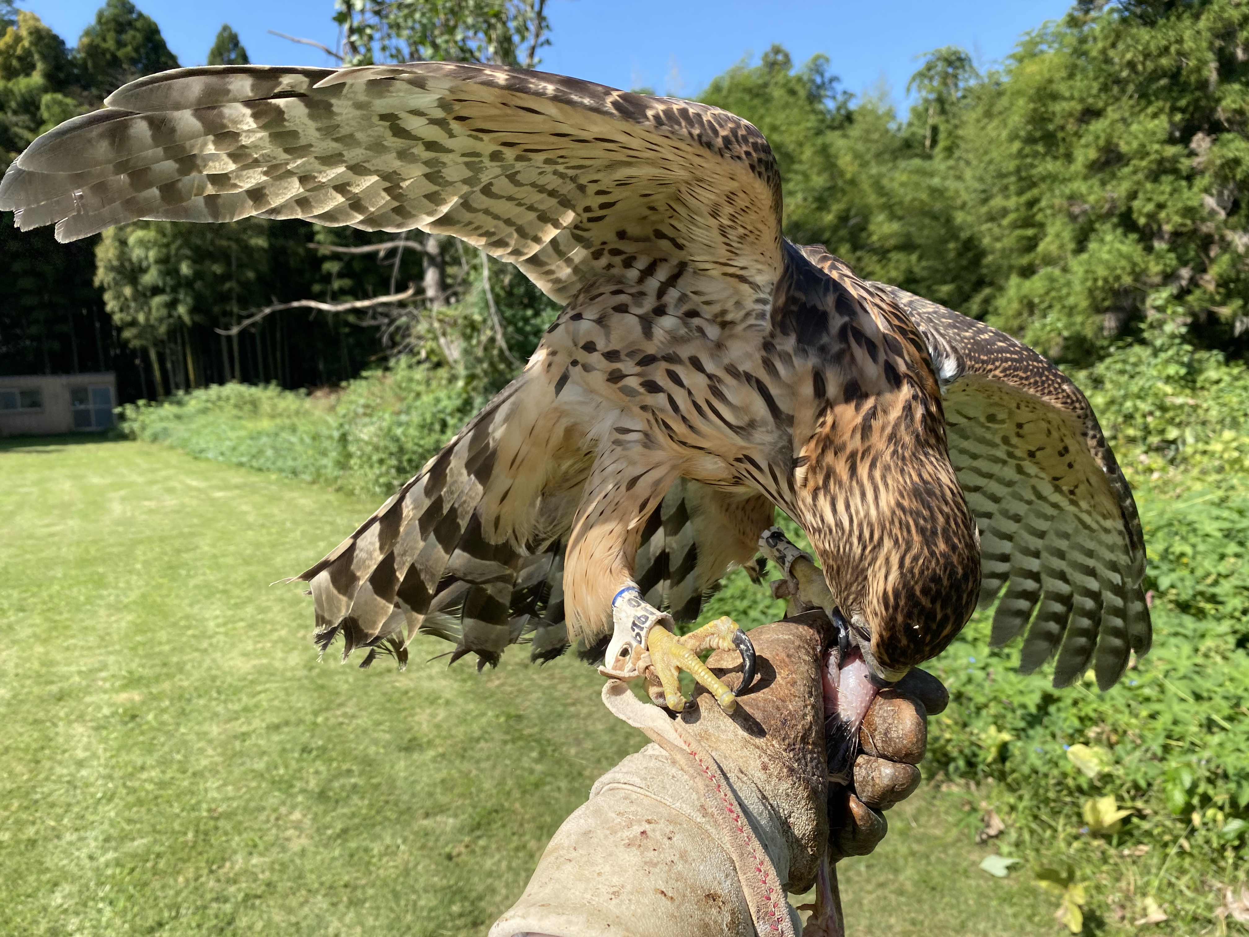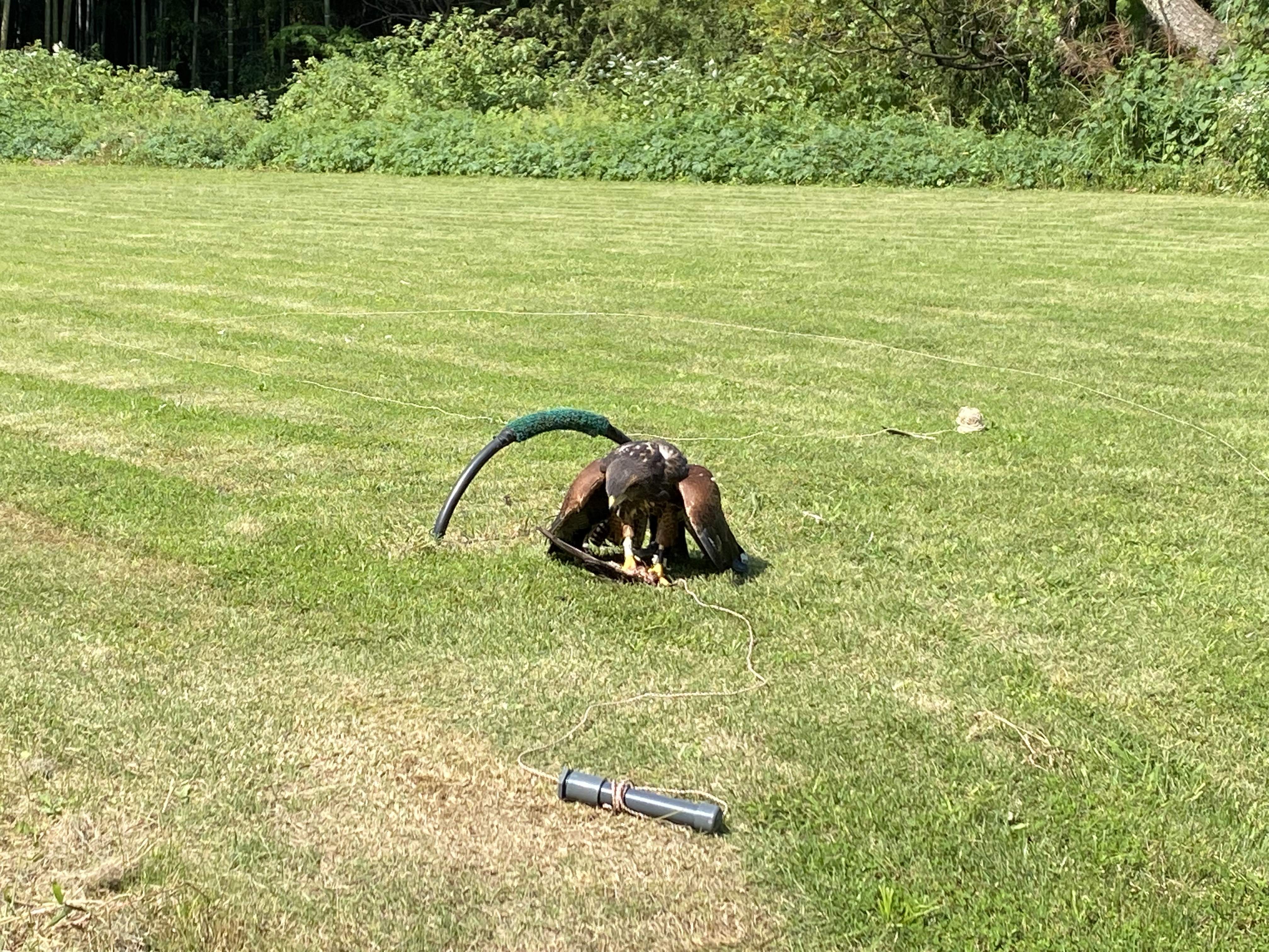 ルアー 外で切餌ポンの後はルアーを一度忍縄付けて距離とって呼んでみたら飛んできました。はじめて飛んだので拳にのるのは怖かったのか地面でしたが今までは餌やりのついでに拳から切餌とらせたりルアー教えたりしましたが、これ以上はちゃんと体重コントロールしてしっかり訓練した方が良さそうです。