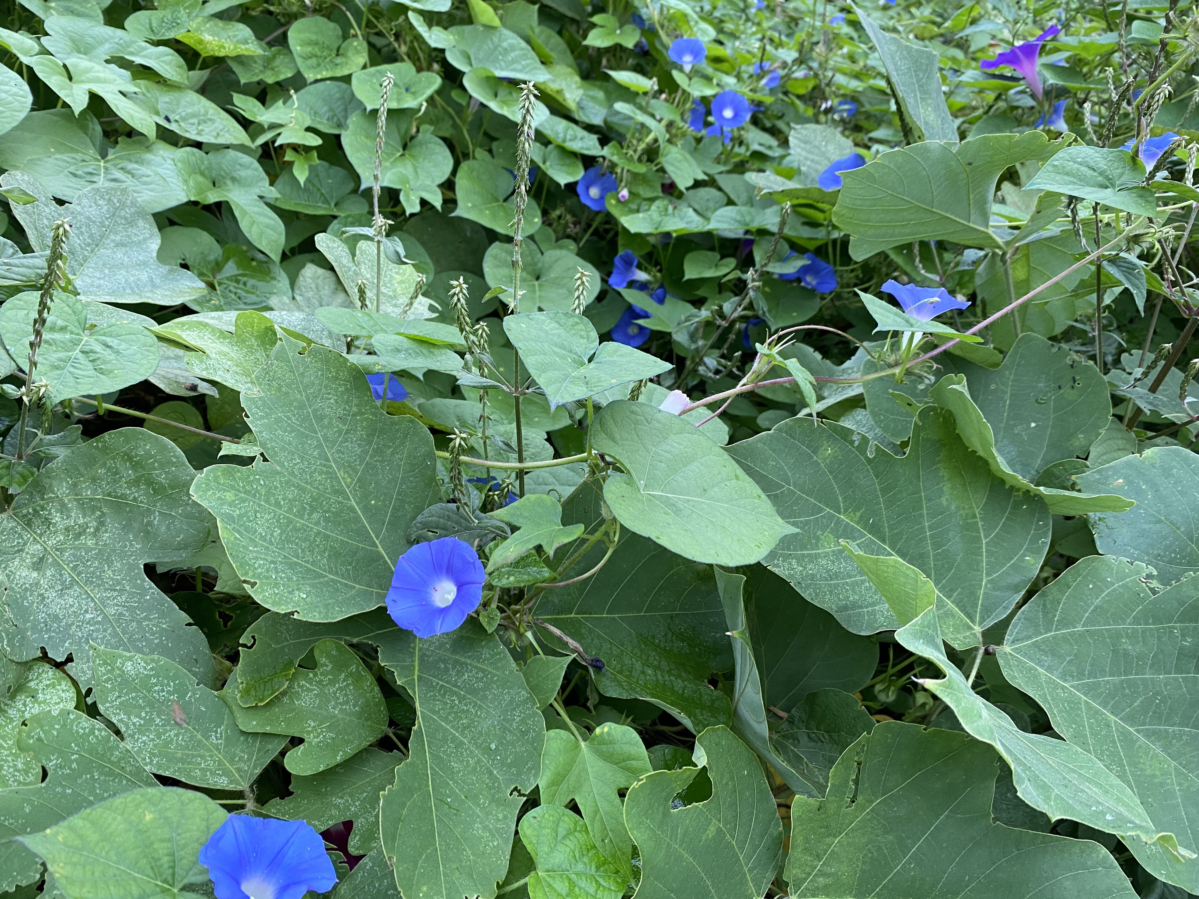 朝顔 今は水色が最盛期。紫より小さい花です。神影はいつも通り芝生で訓練。
