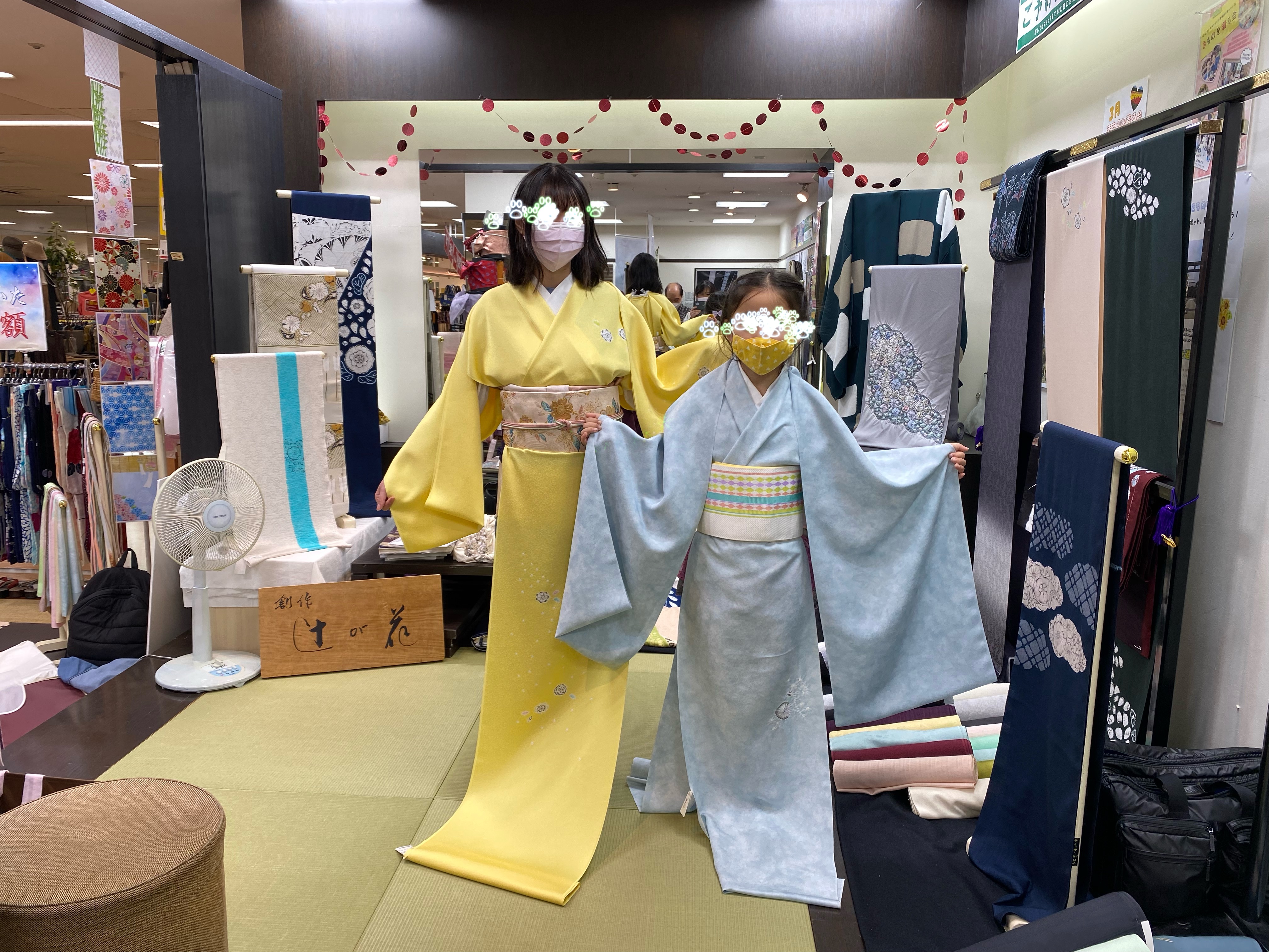 着物屋さん 長女がお世話になっている着物屋さんで辻が花絞りのフェアが。買えもしないのに反物を着せてもらいました。
