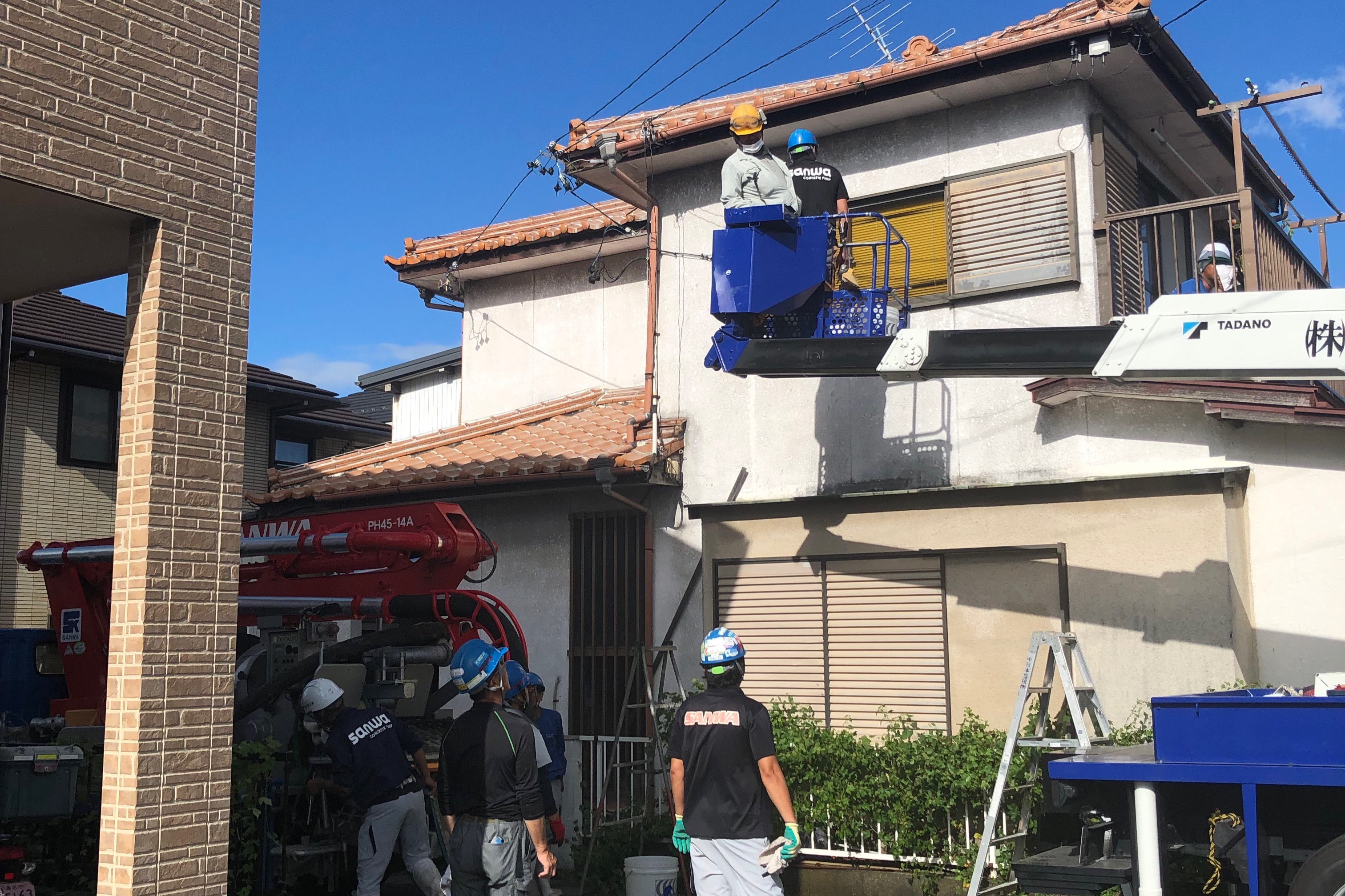 前より綺麗に なってしまいました(笑)斜向かいのお宅でコンクリートを流す作業があり、ミキサー車が作業していましたが何かのミスで洗っていたホースが暴れ?、向かいのお宅とウチに降り注いだそうです。向かいのお宅から連絡もらいました。その為元々作業に必要なかった高所作業車まで駆り出され、屋根から壁、窓やベランダの柵の1本1本まで綺麗にして頂きました。