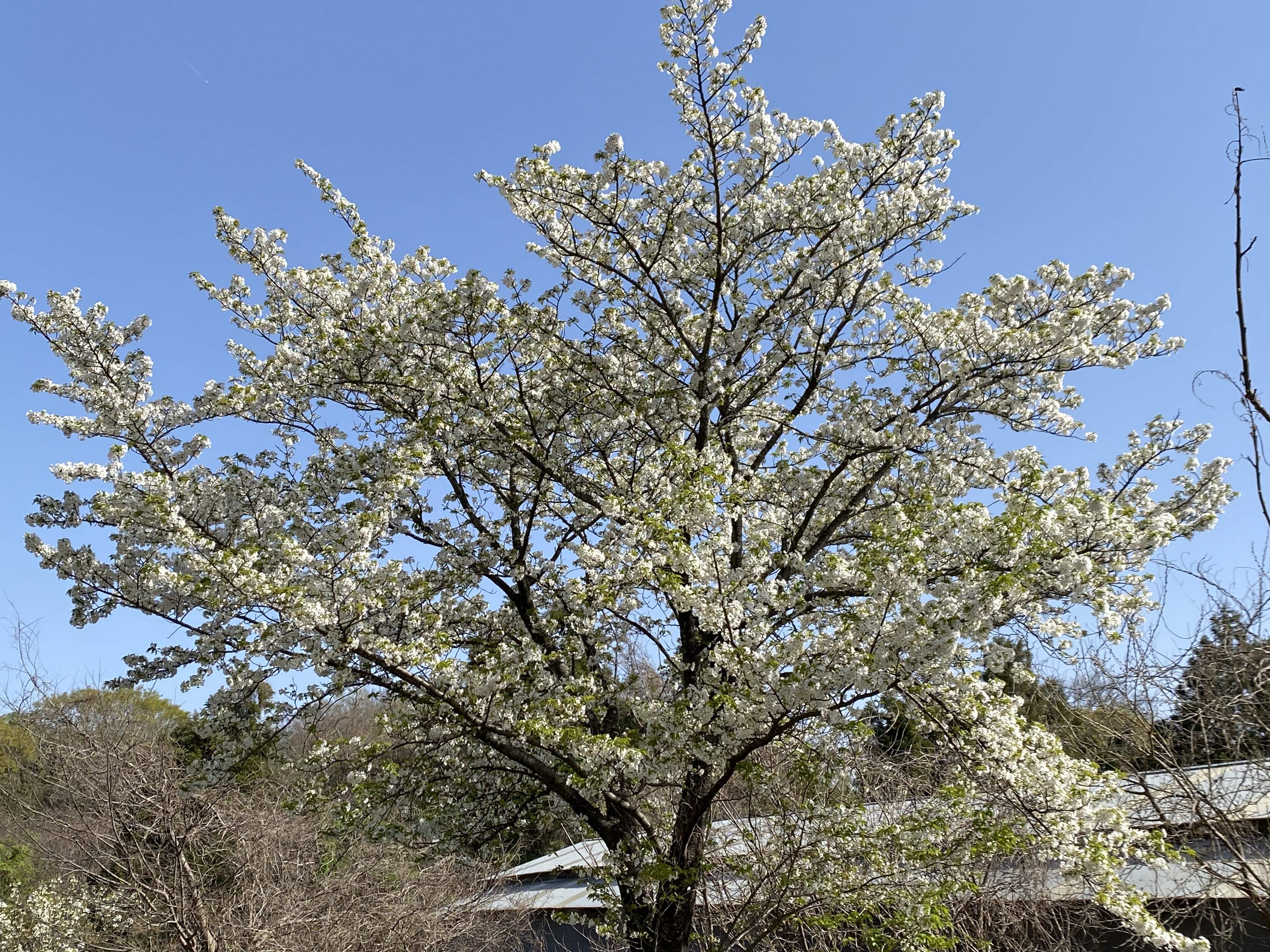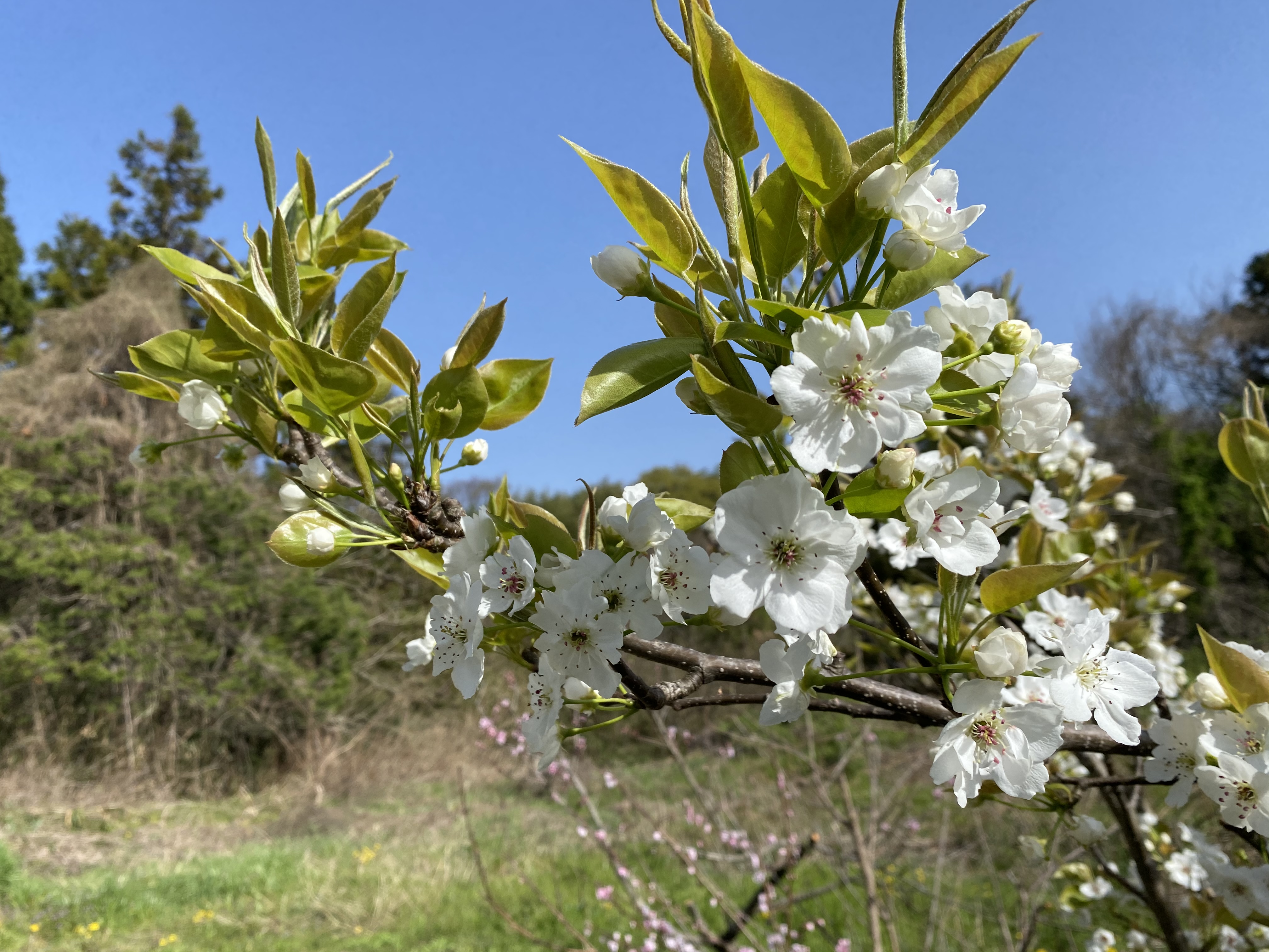 春ですねぇ 梨の花も咲いています。オオタカは昨日今日と敷地内で訓練。