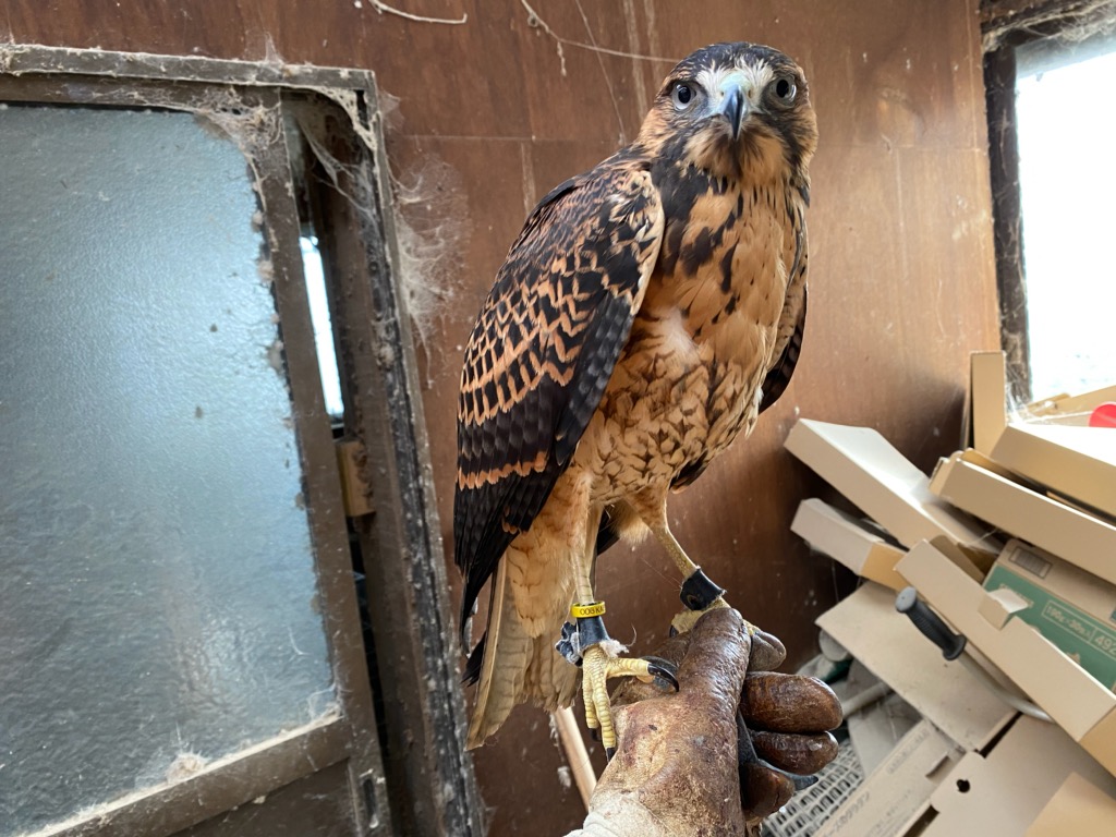 セアカノスリ 足革が切れて交換。まったく訓練していない今年の子ですがおとなしく据えられていました。
