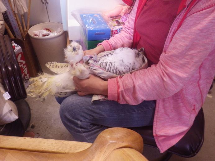 シロフクロウ こっちは入荷です。お客さんのご予約分。良く慣れていて、人の顔見るとみゃ〜みゃ〜鳴いて、かわいかった。もっこもこの足、久しぶりでした。