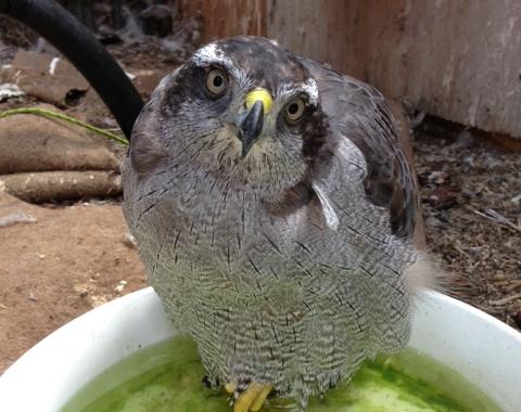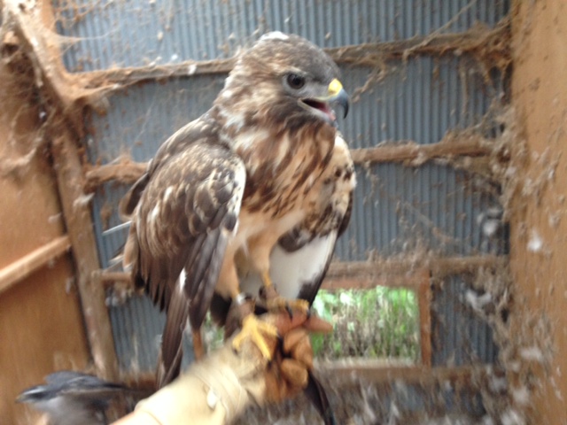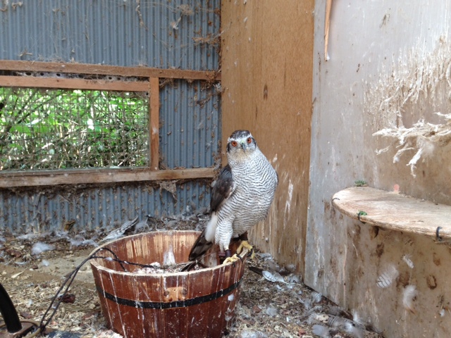 ヨーロッパノスリ 繁殖からあぶれたメスっ子。ペアレントレアードのはずなのに、切れた足革を交換するため伏せた直後で拳に乗る!さすがに口は開いていますが、まったく訓練をしていない・もちろん拳に乗せたことすらないのに・・・※ヨーロッパノスリはダークタイプの流通が主で、このカラーパターンについては、ほとんど輸入されていないそうです。