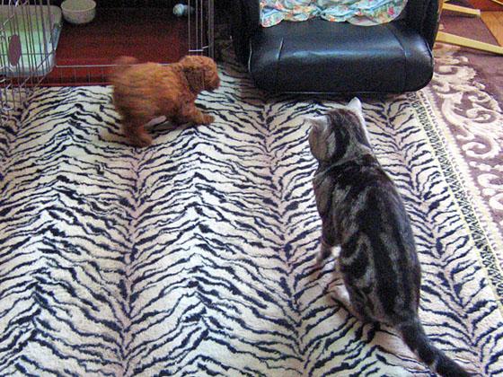怖いものなし! 猫だろうが掃除機だろうがへっちゃらです。雌猫しおりの猫パンチは強烈なので近づきませんがヘタレな雄猫の翔には連日連夜アタック中!