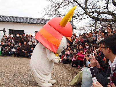 流石、ひこにゃん! 本日は、彦根城での実演です。まずは、ひこにゃん登場で会場の子供も大人も大喜び!ひこにゃんは、みんなの人気者でした。