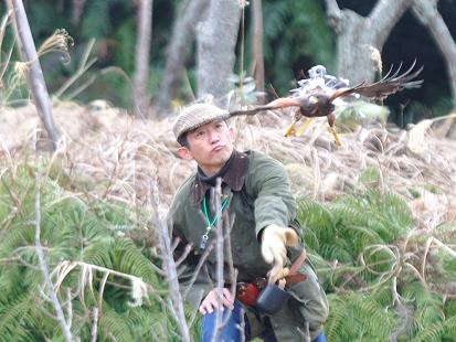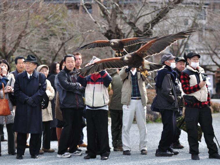 嵐山、渡月橋その6 神内鷹匠のGBの渡り、ルアーによる振り鳩が続き、遠藤鷹匠のハヤブサのルアーリングを披露する。これは、見ていてハヤブサが欲しくなってしまいました。今回の嵐山での実演会は、私としては、満足のいく実演会でした。