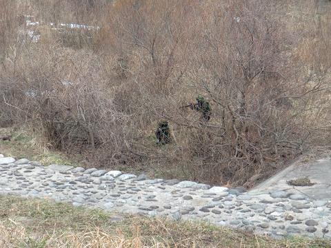 サバイバルゲーム 訓練場所を探して河川敷を移動していると、鉄砲を持った人が林の中を歩いている!猟期は終了したはずなのに、狩猟をしている?近付いて行くと、「自衛隊??」良く見ると、どうやらサバイバルゲームを楽しんでいるようです。