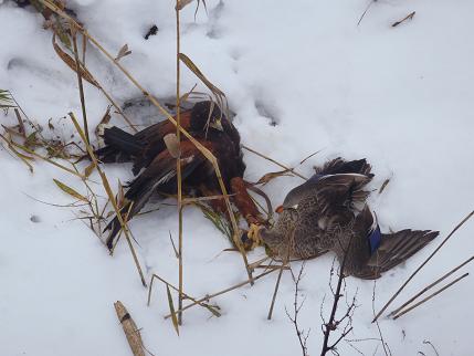 合わせ技 新年2日目の狩りに出る。川幅が広い川に良い感じで鴨がいたので、羽合わせすると、引っ掛けるが掴まえられず着地、鴨も付近に着地する。いつもの雫なら放心状態でボ〜として動かないんですが、すぐに跳びついて掴まえる。午後からは、神内さんと池上さんの2人と合流して狩りをする。