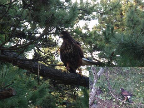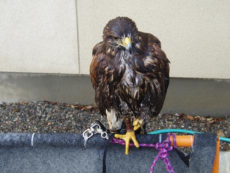鳴き声を聞いたことがありません。 この鳥は鳴くことが出来るのだろうかと心配するほど今日まで鳴き声を聞いたことがなかったのですが、本日、河童で鳴き声を聞くことができました。 今日は、イベントや狩場での共猟が他のハリスと出来るかを確認するために、神内さんに頼んで先輩ハリスの光耀と楓との3羽でフリーフライトをさせて頂きました。 光耀と楓とのフリーフライトを始めると、雛の「ピーピー」声で鳴き始める。初めのうちは鳴き声を聞いて感動していたのですが、だんだん自宅に帰宅しても鳴き続けるのかと心配するほどでしたが、先輩ハリスがいなくなると、いつもの鳴かない雫になり、一安心。