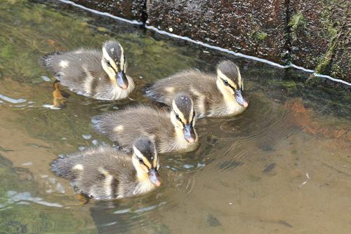 カルガモの雛 犬の散歩をしながら、田んぼの用水を覗いて見るとカルガモの雛が4羽浮かんでいたので写真に撮る。