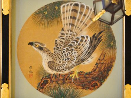 永平寺の猛禽1 永平寺を見学に行ってきました。この永平寺の160畳敷の大広間の天井には、230枚の花鳥図がはめ込まれた絵天井があり、絵の中に猛禽の絵も数枚ありました。フラッシュが使えないので苦労しました。
