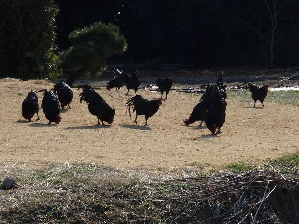 黒いニワトリ? 2羽目を頂いた後、ポイントを廻るが獲物がいない。獲物を見付けても引っかけることも出来ない・・・。思わず「あの言葉」を言わなかったら良かったと本当に後悔する。そんな時、空地に黒いニワトリ?が群れをなしているのを発見!近付いて写真をパチリ!この鳥は烏骨鶏だと教えていただきました。