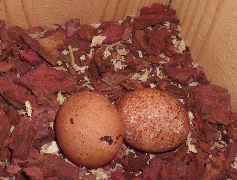 交尾の確認は取れていたのですが「それでも、孵らんことが多い!」と、聞いていたので、不安な毎日! しかも、予定の24日を過ぎても、5個の卵はピカピカ!綺麗な卵なので無精卵!?・・・と、諦めていました。 それが、昨日最後くらいのつもりで(なんかするわけではないんですが・・・)、覗いてみるとヒナが1羽!!