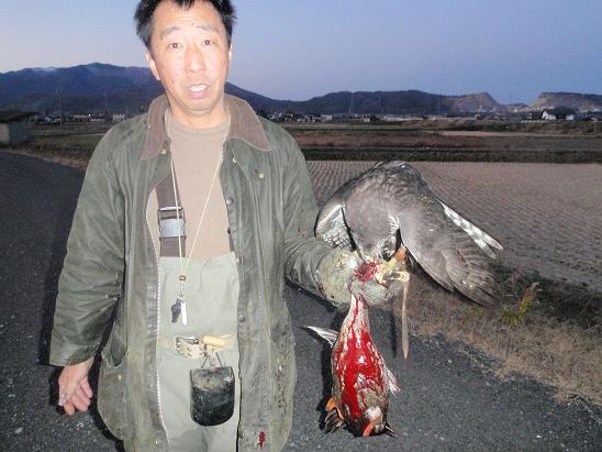 良いお年を・・・ 今年最後の狩りに岡村鷹匠と池上会員の3人で出る。なかなか、良いシーンに出会えず・・・最後の最後で(夕暮れ時&場所的にも)、なんと良いシーンが見られました!!本年もいろいろお世話になりました。来年もよろしくお願いいたします。良いお年を・・・・かみうち