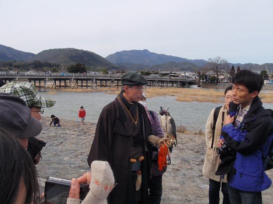 まずは中ノ島に車を止めて準備。その後は鷹を据えて全員で、渡月橋を渡り、楓の木の前で記念撮影・・・ 再度、中ノ島まで戻り、実演を始めました。 このとき福沢鷹匠補は、渡月橋の真ん中へ・・川の真ん中辺りから、ハリスホークの雫を振鳩(ルアー)にて呼んでスタート・・・ その後はハリスホークでの振替、渡り、振鳩(ルアー)・・・ その後は遠藤鷹匠のアフリカンラナー 弟によるルアーリング・・・ そして神滝の振替と振鳩(ルアー)・・・ 最後に再び渡月橋から雫を振鳩(ルアー)で呼んで終了!!