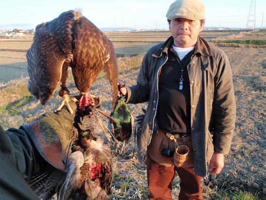 その後、神瀧の獲物を求めて、周辺を徘徊! 水面の幅2mほどの川でカルガモの群れと土手にいるキジを発見!なんか獲らねば的な発想が頭をよぎり、とりあえずカモに・・・キジが飛んだら、池上会員に飛んだ方向を見ていてもらおうと・・・ しかし、カモは横っ飛び・・・神瀧も突っ込みかけてスルー・・・キジは伏せて飛ばず・・・ カモは諦め、池上会員がキジを追い出す・・・飛び出したキジに羽合せるも、神瀧はカモと思ってか無視!! キジは40m程飛んで近くの藪に降りた。直ぐに池上会員が入り、再度キジを出す。私の目の前に飛び出し、羽合せた神瀧とはぶっちがい状態・・・神瀧は反転して、低空で追いかける。200m程飛んで民家脇の藪に消えた。神瀧も最後まで追ったようで、民家の屋根で見込んでいる。直ぐに下ろして、藪の反対へ側で待ち、池上会員に藪を押して貰うと、直ぐに出ました。しかし、またもぶっちがいに近い状態で、神瀧は急反転しながら追いかける。キジは100m程先の藪に突っ込んだ。それを追いかける神瀧はいったん上昇し上から突っ込む! カラスが騒ぎ出し、神瀧とキジが消えた辺りに、行くと神瀧が地面に・・・キジは見えない。「逃げられたか!?」と、とりあえず神瀧を据上げようとすると、神瀧はなんかと絡まっているような感じ・・・近くで見ると、足の下からキジの尻尾が・・・ ちゃんと掴んでいたようです。 直ぐにキジを抑えて羽を組み、やっと一安心!!