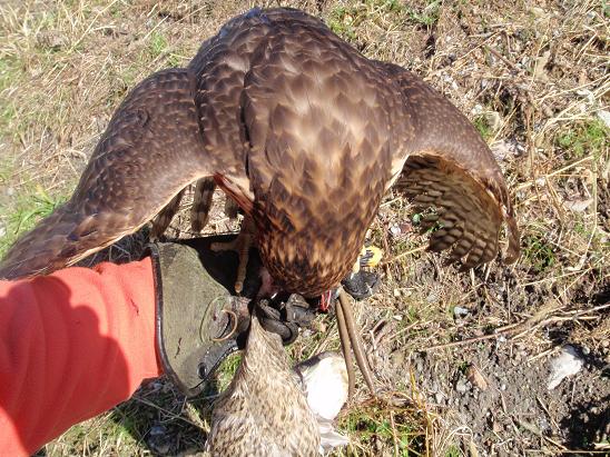 爪がコンクリートなどで擦れて坊主になってはいます。数日前までは掴んだ後に逃げられる・・が、多かったのですが、最近は絡んだら獲る。・・・になってきました。もちろん「野爪/のづめ」にしようとも思ったのですが、カルガモ程度ならむしろ掴み所を勉強させるのに良いかな!?という感じで、このままにしています。 兄(オス)なら迷わず野爪にします。カモ類は重いだけで、弟(メス)ならパワーで強引に獲り切れます。また、シアミ(他で言う「入れ込み」「入れ」・・・要は猟欲)が、よく出ているので、獲れなくてめげる感じもしないので・・・・