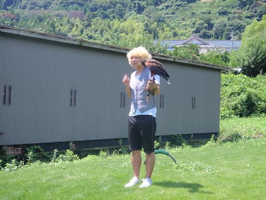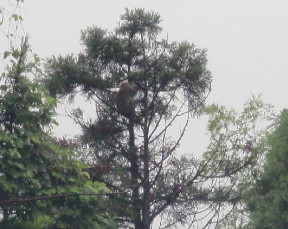 明日の撮影のこともあり、朝9時頃から楓を飛ばす!しかし、肉色が高い(妙に下がったのでわざと上げた)ことが原因か、高い木へ上げると逸れるはずがないシチュエーションで楓が逸れた(威嚇の声を出したような・・・出していないような・・・)・・・その後はすぐに拳へ戻ったが、また高い気に上げると変な方向を見ている・・・杉の木の木陰がなんかおかしい・・・よく見ると杉の木と竹やぶの奥の杉の木?に数頭のニホンザルが・・・
