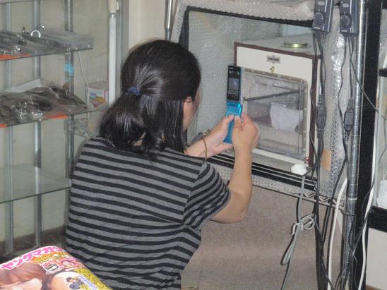 腕が・・・ 2羽目のアナホリフクロウ孵化の瞬間を、撮影中のかみさん・・・それを撮る私・・・