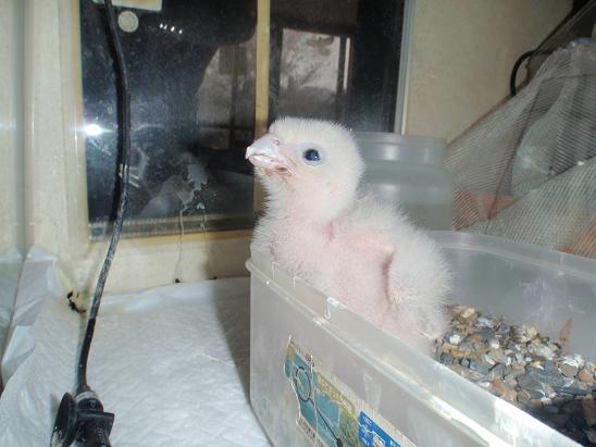 2月末頃発情していたラナーハヤブサのペアのメスが見えなくなって、2月27日に覗いてみると3個の卵を抱いていました。このペアは2005年生まれで一昨年、昨年と卵を産んでもいなかったので、良くて1羽、孵化しなくても・・そんなもん!?的な感じで受け止めていました。予定日の前日(4月1日・35日目?)に「ペアの様子が、こんなんでも無精卵・・・」的な、話を聞かされたので、一気にトーンダウン!! ・・・で、2日の朝、なんとなく巣の下(廊下の頭上が巣になっています)で、耳を澄ますとヒナの声っぽいのが複数・・・たまらず、覗いてしまいました。するとヒナが3羽!! 今回は少なくとも2羽はペアレントレアードにするつもりなので「う〜ん!?」今度は上手く育てるかの心配が・・・