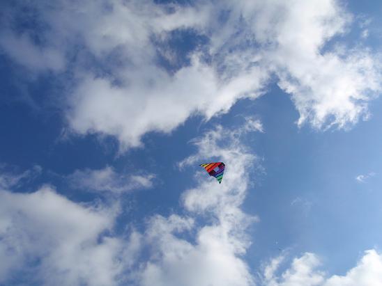 カイトトレーニング 遠藤鷹匠のハヤブサをトレーニングするために上げたカイト!美しい青空に、カイトが上がっています。しかし、トレーニング自体は裏目、裏目になってしまいました!!