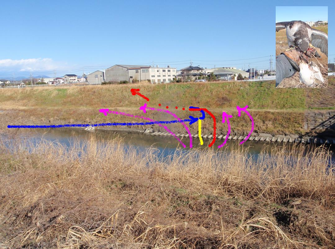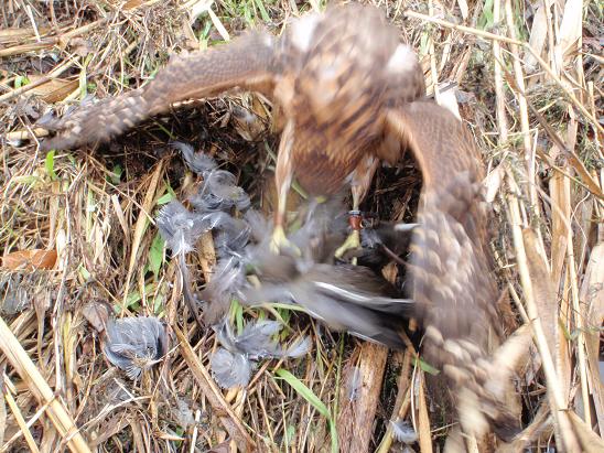 本日も福沢鷹匠補の地元へ・・・ 先日の狩りとは違い獲物は少なめ・・・・また、昨日に続き風も強い。途中ブログ調べのラーメン屋に寄るが私は今一つ・・・その後、遠藤鷹匠が合流。 大きめの河川を回る。 川幅10〜12m、堤防から堤防で25〜30m近く・・・ここでカルガモ・マガモ・コガモ・ヒドリガモの50〜60羽の群れに・・・カモの飛び立ちとほぼ同時くらいに霞を羽合せる。群れに一直線に飛び込む霞はカモと交錯して対岸に下りた。マガモのメスを掴んでいたのだが、1〜2秒で放してしまった。しかし、対岸で何かを抑えている様子・・・羽も引いている。直ぐに走って据上げに行くとコガモを押さえていました。