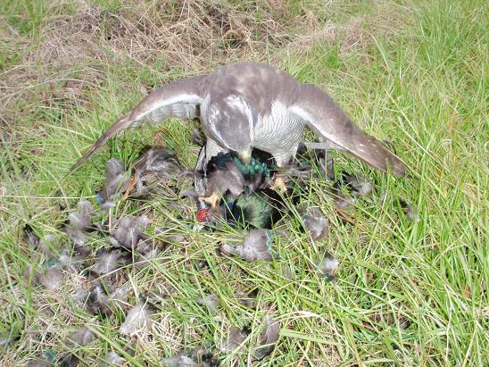 遠藤鷹匠が「今日はキジが獲れそうな気がする」の言葉で・・・キジ狙いで、とある場所へ・・・ 河川敷で出たキジに霞を羽合せる!!300m程追って行って、電柱の上に霞を見つける。見ている方向から林脇の笹薮が怪しい。霞を拳に戻し、ホワイティが笹薮に入ると「ゴト、ゴト、ゴト・・・ッ」霞を羽合せると葉の落ちた木の上にキジが引っ掛かるように止まる。霞も木に止まるが居るのは解っているが、見えていない感じ・・・しばらく膠着状態!キジが動くと霞は追った。しかし、また木に止まったキジに突っ込みきれない。霞を降ろし、羽合せられる位置に付き、遠藤鷹匠が近づくと、キジは再び飛んだ。霞を羽合せするとキジは壁に激突・・・落ちたところへ霞が滑り込むが、キジは死んでおらず、そのまま走る。そしてまた先ほどの笹薮へ・・・霞も笹薮の中に入り、追い回す。その後捨ててある材木の下を抜けてキジは反対側へ・・・霞を据上げ、ホワイティが探すが、その時にはキジに逃げる力はなく・・・そのまま遠藤鷹匠が手掴み・・・獲ったには獲った・・・であろうが、なんだかなぁ!?☆