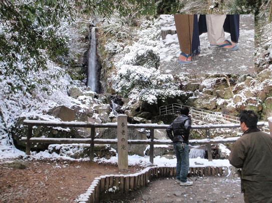 冬季研修会・・・4 朝起きるとわたらい先生が養老の滝を見に行くと言い出した。最初はみんな面倒くさがったが、結局全員参加で見に行く事に・・・・そんな中、寒がっているにも拘らず、この人の下半身は別人格のようで・・・草履履き!?