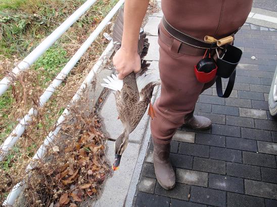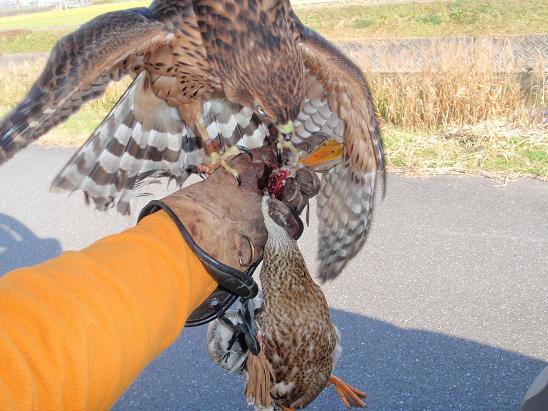 刹那で小場所をつつきながらウロウロ・・・獲物は少ない。最近は大型カモ類は狙っていないのだが、今日は、それらも居ない・・・ しかし、先日刹那でハシビロガモを獲りそこなったところに、また同じ個体達と思われる♀が3羽入っていました。 プレッシャーを掛け、刹那を羽合せと2羽は斜めに・・・1羽は迫ってくる刹那に気圧され対岸を急上昇!!刹那はそれに付いて行って、足を突き出しお尻を引っ掛けるように掴みきりました。これでコガモに続いてカモ類は2種類目。サイズ的にカルガモは無理そうなので、この辺りでは比較的多いヒドリガモを次は狙ってみたい!!・・・とは言っても、そうそう良いチャンスはないのだが・・・ ☆☆