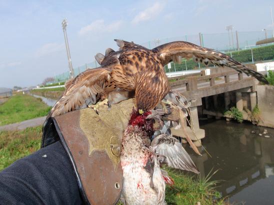 昨日の汚名返上とばかりに刹那を連れて実猟に出る。 しかし、私のやる気と刹那のやる気はズレがある!人鷹一体・・・には程遠い状態である。 彼の「獲れる」は、まだ私の「獲れる」とは一致しないのである。 「それは獲れるだろう!」と言うのをミス!または狙いとは違うのを追う。はたまた、生追い・・・ さらにはコガモ狙いで羽合せるも、カルガモに掛かる始末、挙句に押さえ切れず・・・ その後も奮闘するも、結果を出せず・・・ 後残り2箇所と言う所・・・川幅4〜5m程、堤防から堤防で幅10〜12m程の川で数羽のコガモに羽合す!!目の前に2羽が棒立ち・・・・左のは左曲がりで・・・右のはほぼ正面堤防に向かって飛び出す。刹那は左のを追いかけるが、なぜか右のコガモが迫って来た刹那(左の狙っているのでそのまま逃げられたのに・・・)にパニくって堤防を越えられず落下(おそらく本鴨は水面に戻るように)!刹那にとっては完全に後方での出来事にも拘らず、左のを追うのをやめ反転・・・右のが落ちたであろう地点の直ぐ上の堤防に降りて様子を伺う。おそらく本鷹は「ここにいるはずだ!」と理解している感じ。その数十秒後、ふわっと落ちたであろう藪に姿を消した。しばらく待っても出てこないので、獲っているであろうと半ば確信し、据上げに向かう。やはり獲っていました!!