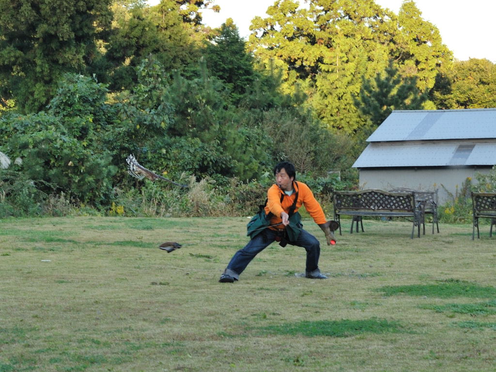 そとへ・・・ 霞は今期初めての外での訓練。最初はカラス等を見込んで降りてきませんでしたが、口餌で降りたら、餌合子でもポンポン!風が強く、流されながら、また上手く風に乗りながら、50〜100mの渡りを20本程度行いました。