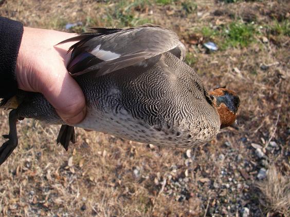 写真、左下ら辺に7〜8羽のカルガモが群れていました。川幅は5〜6m程。右に1羽、他の6〜7羽は橋の際・・・近づき、プレッシャーをかけると、左右に別れ飛び出しました。右の1羽は当然右なんですが、そのカルガモに霞(青の線)を羽合せ!すると何を思ったのか、左に向けてカーブし飛んでいきます。しかし、左のカルガモ達(ピンクの矢印・結果橋の下を抜けていきました)が低めに飛んだ為、直ぐに切り返し右の1羽(赤の線)に目標を変え、猛追します。右のも棒立ちではなく、低目から急上昇の感じだったんですが、霞は追いつき、ちょうど横の電柱の高さ・・・・地上から10m程(紫の×)でしょうか!?で、足に掴みかかり、そのまま絡んで落ちてきました。カルガモは川の砂地に「ボコン!」と言う音と共に落ちた為、据上げにいったときには、首が曲がってヒクヒクしていました。まぁ、川の掘り込みが2m弱あるので12mほど上からの落下の衝撃になりますから・・・・正月早々、なかなか良い追いが見れました。 ☆☆☆☆☆