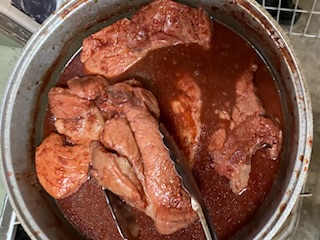 タレの漏れたフリーザーパックが見つかり、捨てる前に中身を確認(紅麹入りの叉焼ダレだった)してと思うも、あげく捨てられず「紅い焼豚」(二股の串で刺して作るのが又豚)を作ることに・・・