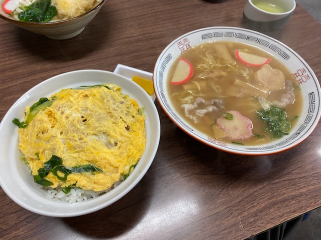 贅沢にも・・・ 「カツ丼」¥550 「中華そば」¥400を頼んじゃいました! 美味しくなかったら来ないだろうから、評判の良いこのふたつは食べときたかった!! かみさんは「天ぷらうどん」¥500を・・・