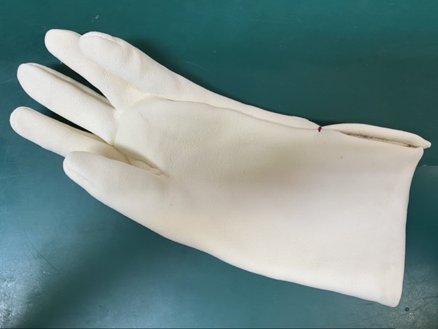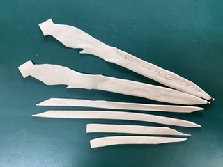 白い鹿革の「鞢/エガケ」 傷が多く小さめの鹿、所謂「小鹿/こじか」の白い丸革が、少しお安く革が手に入ったので作ってみました。傷の位置が悪く「鞢/エガケ」は作れないようなのもあります。諏訪流と言うか宮内省では「燻し革/いぶしがわ」ですが、使っていると色褪せしますし、どの道血で汚れることを考えれば、白でも良いのかな!?・・・と手を入れた感触は、悪くないかと思います。写真のには緒が付いていませんが、もちろん取り付けて完成させます。