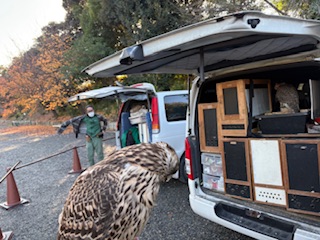 二班に分けたので、人不足!? また私とかみさんはオオタカを据えていたくて、実演では待機が主。 そんなこんなでバタバタしましたが、なんとか実演を終えることが出来ました。 喜んでもらえたなら良いのですが・・・・ 私は鷹の扱いで恥ずかしい大失態をしでかしました。 幸い鷹は元気なんでことなきを得ましたが・・・
