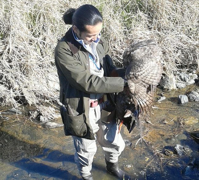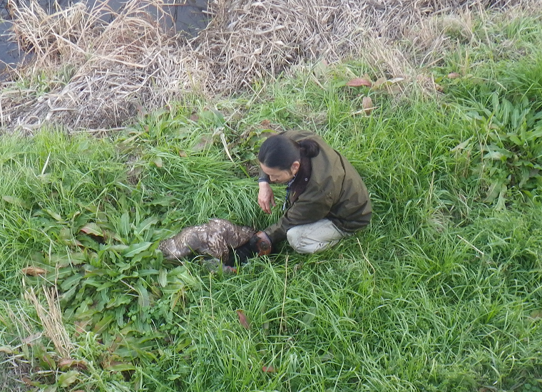 日本放鷹協会会員の衣笠です。 本日、弥勒(オオタカ♀)と2週間ぶりに2回目の鷹狩りに行ってきました。 しょっぱなに幅2m程の水路にカルガモを1羽見つけました。 1羽だったので『半矢かな??』と思いながら近づくと飛び立ちました。半矢は経験済みだし、半矢なら獲る気は無かったので、羽合わせが遅れましたが、なんとか追いつき落ち際でカルガモを押さえました。 弥勒にとって、初めて空を飛ぶ野の獲物を捕らえる事ができました。嬉しかったぁ・・・・(^_^)/~ その後は、やはり獲物にはなかなか出会えず時間だけが過ぎていきました・・・。 そして、次にカルガモを見つけ、羽合せると空中で掴みましたが、掴みどころが悪く川の中で離されてしまいました。 結果4回カルガモにあてる事ができ、1羽獲りましたので、今回も弥勒にとって良い経験になったと思います。