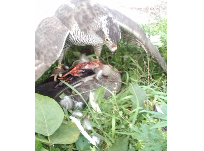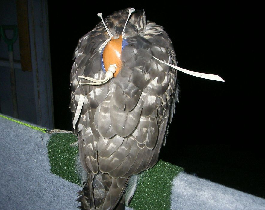 日本放鷹協会会員の衣笠です。 オオタカ♀(フィニッシュ×ヨーピアン)の名前は、弥勒(みろく)にしました。 写真はフード仕込みを初めて2日目の弥勒です。まだ2日目なのに、フードを被ったまま寝ています。 現在は、早朝より訓練をしています。まだ忍縄付での渡り(餌合子 口餌)やルアー仕込みを行っている段階です。昨日は頭を蹴られました・・・。(ニット帽を被っていたのでケガはしませんでしたが・・・。) でも、今日はいい感じでした。 日々進歩しているのが分かるので、今が一番楽しい時期です。こんな調子で、弥勒と共に頑張っています。