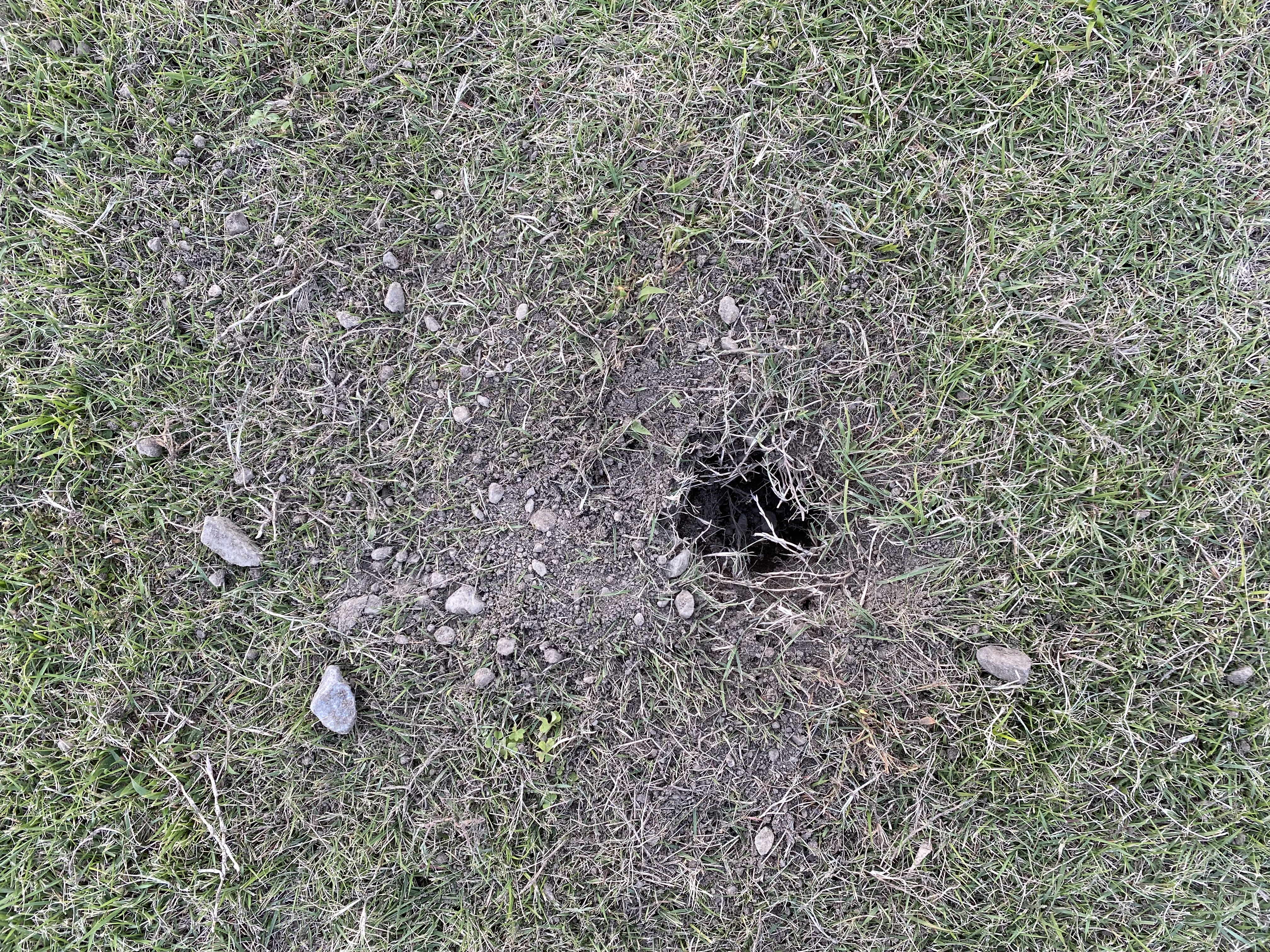 転けかけた〜 芝生に穴があいてました。なんの穴?訓練中、足をとられてカックンとなったじゃないか…