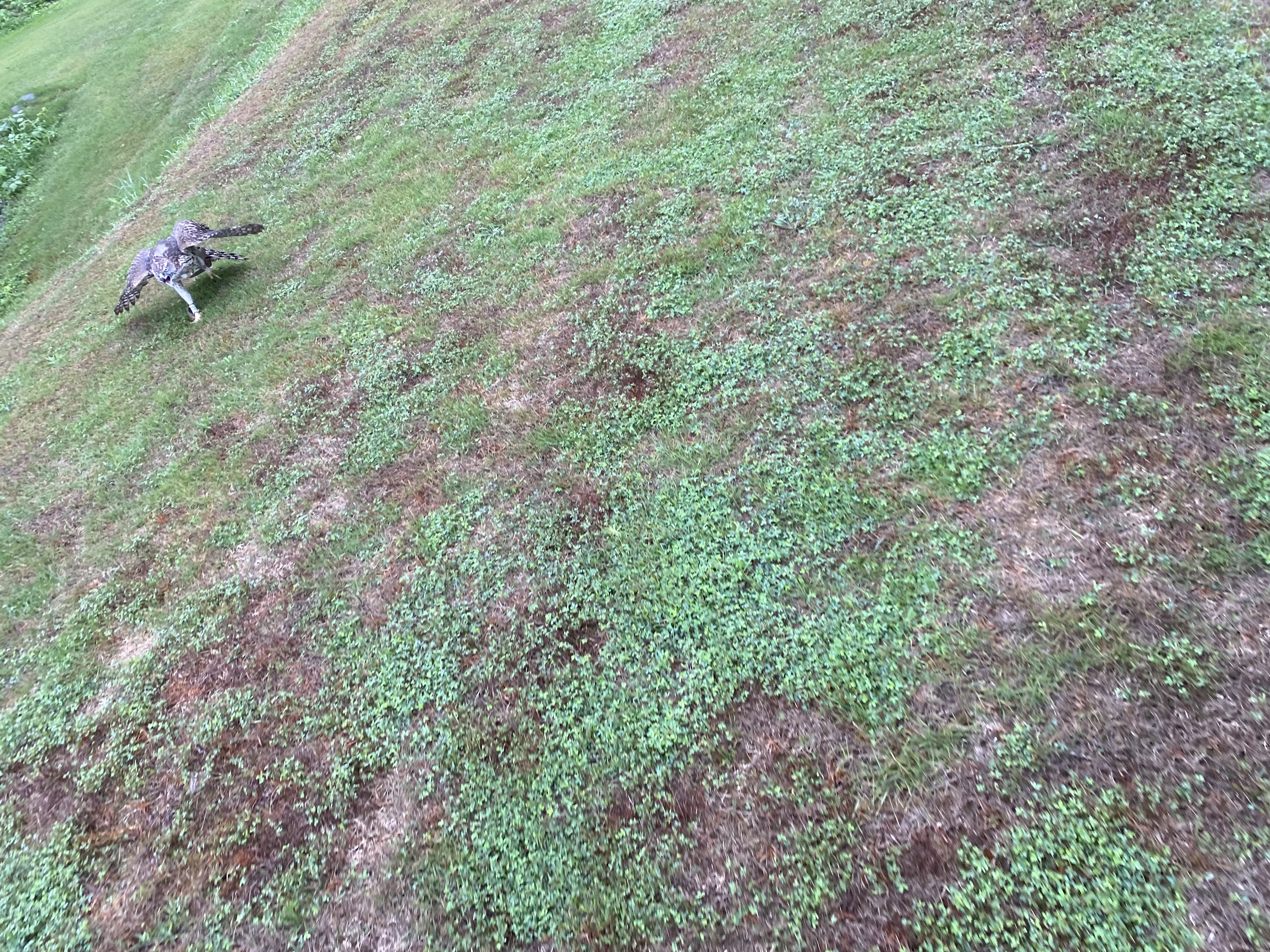 なかなか 屋根や木にはあがりません。基本、羽合わせても無理やり地面におりて走ってきます。私、逃げます…